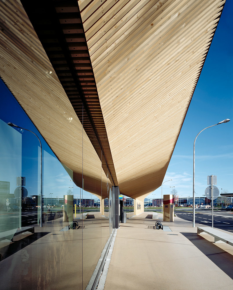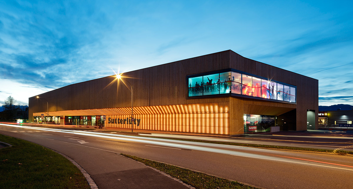 „Aus der Region für die Region“ gilt bereits seit über zehn Jahren als Leitspruch und Slogan des Vorarlberger Lebensmittelmarkts Sutterlüty. Diese Einstellung wird einerseits durch ein großes Angebot regionaler Produkte zum Ausdruck gebracht, andererseits spiegelt sich die Firmenphilosophie in der Architektur der Filialen wider. Seit 2002 der Sutterlüty Markt in Weiler als Prototyp des neuen Markthallenkonzepts errichtet wurde, entstanden bereits mehrere Filialen, welche dieser Strategie folgen, aber immer individuell auf die örtlichen Gegebenheiten eingehen.Beim neuen Einkaufszentrum in Hohenems wurde dieses Prinzip des Lebensmittelmarkts beibehalten und um ein Sportfachgeschäft erweitert. Das Grundstück nahe der Schweizer Grenze liegt an einem Kreisverkehr im Handelsgebiet zwischen Autobahnabfahrt und Ortseingang. Die Gebäudeform reagiert auf die komplexe Geometrie des Bauplatzes und die besondere Erschließungssituation. Dabei wird das Grundstück optimal ausgenutzt und ein Großteil der Parkplätze wandert in die Tiefgarage. Bescheiden jedoch wirkungsvoll entfernt sich das Gebäude von der Form einer „banalen Kiste“ zu einer plastischen Gestalt. Die Fassade aus senkrechten Fichtenlamellen lässt aufgrund ihrer zurückhaltenden Materialisierung die Plastizität des Bauwerks voll zur Geltung bringen. Die beiden „Schauseiten“ des Holzbaus zeigen sich formal ausdrucksstark: Richtung Kreisverkehr öffnet sich der Bau und zeigt sein Gesicht. An der Längsseite parallel zur Landesstraße ist die Fassade im Erdgeschoss eingeschnitten und parkplatzfrei gehalten, wodurch ein großzügiger Vorplatz für den Haupteingang geschaffen wird. An der Rückseite befindet sich die Abfahrt in die Tiefgarage, über der die Restaurantterrasse auskragt.