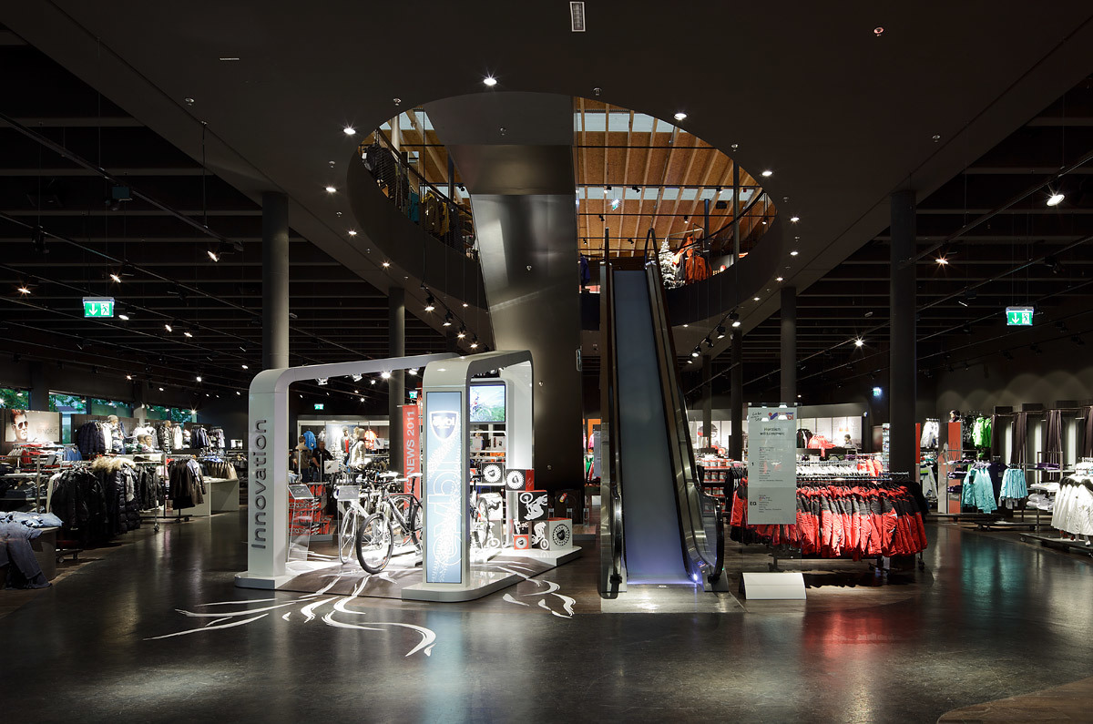 Über Haupteingang und Lifte aus der Tiefgarage gelangt man in eine zentrale Halle, von der sowohl der markthallenartige Lebensmittelmarkt als auch das zweigeschossige Sportgeschäft betreten werden.
