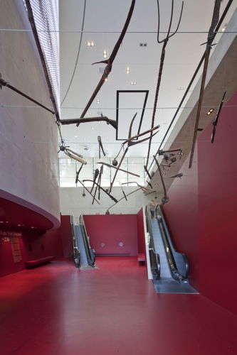 Nach dem Lösen der Eintrittskarte wandert man langsam an der Glasfassade entlang. Dramatische Kulisse. Geschnitzte Holzfiguren des Südtiroler Bildhauers Willy Verginer bieten einen ersten Vorgeschmack auf 1809. Über eine winzig schmale Rolltreppe fährt man schließlich runter in den Berg. Drängeln und Überholen unmöglich, hier gemahnt die Architektur an Ruhe und Gemächlichkeit.