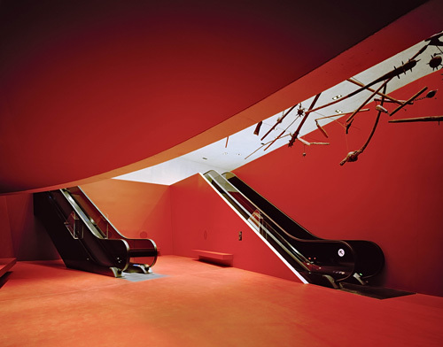 Über der massiven, rund 30 Meter breiten Betonbüchse, die bullig in der Erde steckt, balanciert nun, mit präzisem Strich in die Landschaft skizziert, eine gläserne Vitrine mit 66 Meter Länge und 40 Meter Breite. Kein Gramm Fett zu viel.