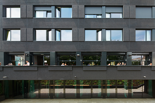 Kümmern wir uns lieber um die Gebäudehülle. Denn während innen radikal entkernt wurde, blieb an der Fassade das meiste beim Alten, auch wenn sie gründlich überabeitet wurde. „Von Anfang an war klar, dass der Waschbeton erhalten bleiben muss“, betont Erich Bernard. Also wurde innen gedämmt und außen nur lasiert. Die schwarze Farbschicht, die einheitlich über die Platten und Fugen gelegt wurde, unterstützt die Sichtbarkeit des Gebäudes im Stadtbild bedeutend. Die alten Fenster mussten ersetzt werden, keines der heutigen Produkte konnte mit den fein detaillierten alten Profilen mithalten, denn mag man es gut gedämmt, muss man statt der zarten Optik im besten Fall eine vollschlanke in Kauf nehmen. Eine Sonderanfertigung ließ das Budget nicht zu. Also baute man die neuen schwarzen Fensterrahmen so hinter der Betonfassade ein, dass die Proportion der Fassade gewahrt blieb.