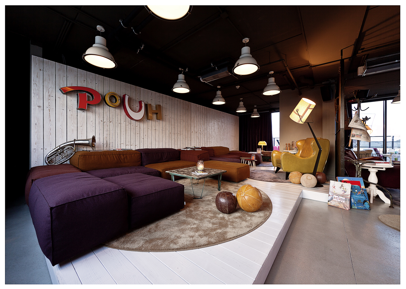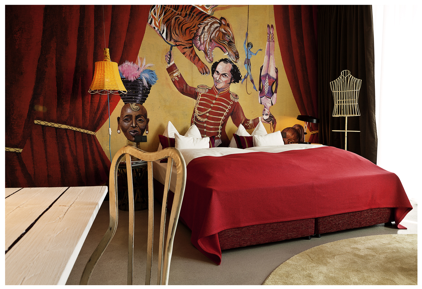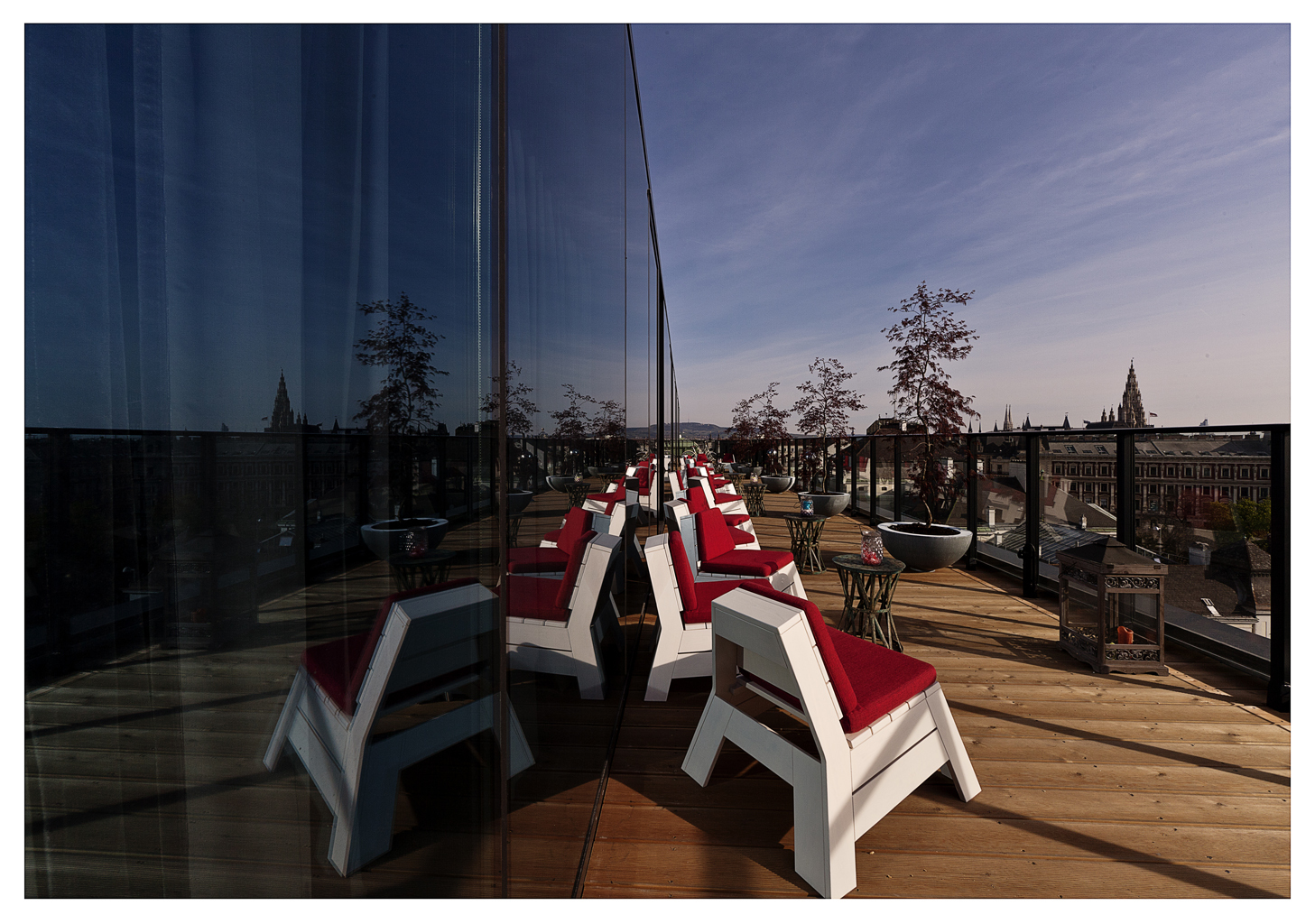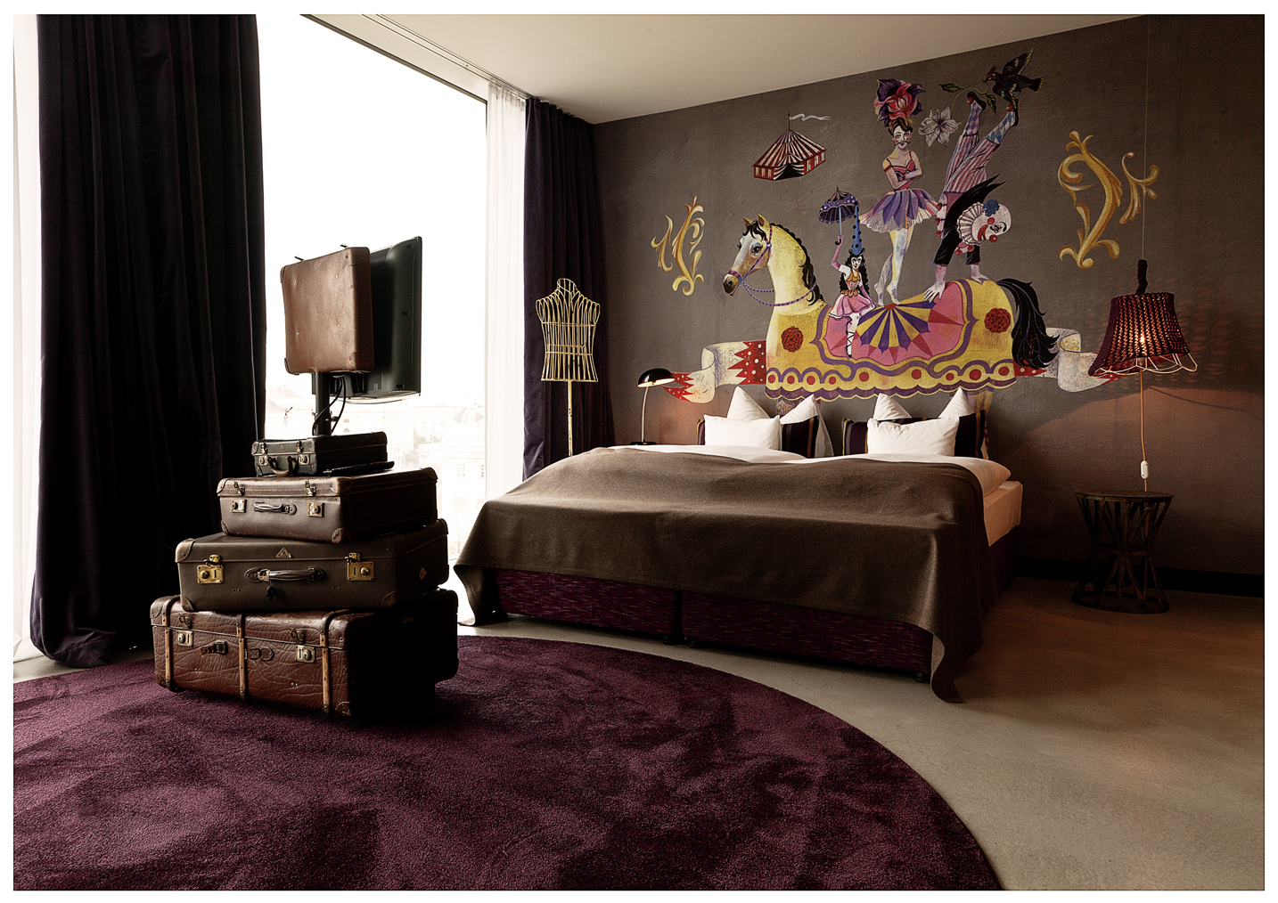Sein größter Mangel, so Markus Kaplan –Partner der Bürogründer Erich Bernard, Johann Moser und Daniela Walten –, war, dass es städtebaulich zu defensiv war. Die Aufstockung verleiht ihm nun die notwendige Höhe, um mit der Umgebung in Dialog treten zu können. Mit dem gläsernen Aufbau wird das System des Bestandes weitergestrickt. Der Rücksprung wird zur Fuge, und obenauf dockt in neuer Materialsprache, aber ähnlicher Gelassenheit der neue Quader an, dessen oberstes Geschoß – eine Dachbar – wiederum zurückspringt. Die großartige Aussicht wurde medial bereits ausgiebig gewürdigt. Ebenso das sich um das Thema „Zirkus“ drehende Gestaltungskonzept, das die „25hours Hotel Company“ beim Augsburger Interiordesign-Büro Dreimeta beauftragt hat.