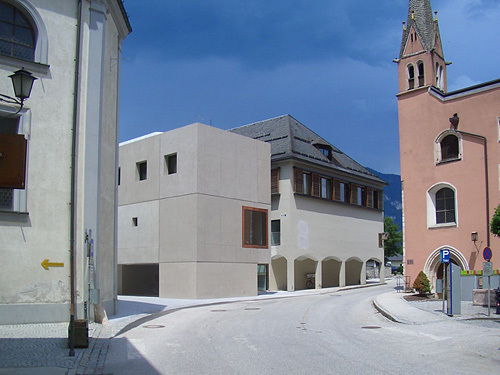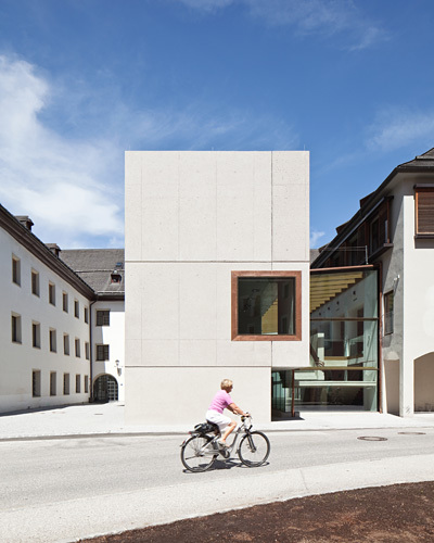 Der vom Innsbrucker Architekten Daniel Fügenschuh entworfene, hochrechteckige Baukörper nimmt gut die Hälfte des Schulhofs ein und lässt den historischen Bestand nahezu unangetastet. Trotz der Verengung auf einen schmalen Streifen bleibt genügend Hofraum übrig, der erstaunlicherweise nicht schlauchartig wirkt, dafür aber die Aufmerksamkeit auf den Hauptzugang im Altbau lenkt. Das gesamte EG ist von Nutzung freigehalten und dem Außenraum als überdachter Freibereich zugeschlagen. In seiner Kubatur und Proportion entspricht der Neubau der Körnung der Umgebungsbebauung, typischer Inn-Salzach-Architektur aus simplen Quadern ohne Giebel oder nur mit Andeutungen davon, mit flach geneigten Satteldächern meist ohne Überstand. Wie bei der Nachbarbebauung überwiegt bei dem massigen Baukörper der Wandanteil stark, nur wenige, recht kleine Fenster durchbrechen die fein gegliederten Flächen. Arbeitsfugen teilen sie in einzelne Felder auf, von denen einzelne schalglatt belassen, andere poliert oder maschinell gestockt wurden. Trotz aller gestalterischen Strenge ergibt sich daraus ein lebendiges Fassadenbild. Beide Schalen des Baukörpers wurden in kleinen Fertigungsabschnitten aus Ortbeton hergestellt – ein Verfahren, das den Bauunternehmer sehr gefordert, wenn nicht überfordert hat; einige Kanten sind bereits ausgebrochen.