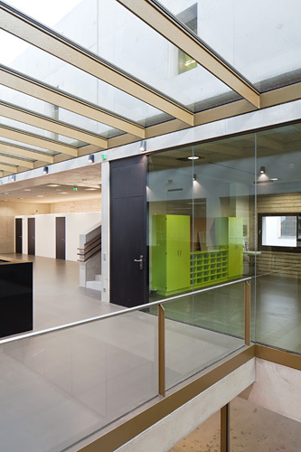 Die bestehende Sporthalle nebenan hat nicht nur eine Auffrischung erfahren, sondern wurde auch um einen niedrigen, vollverglasten Vorbau erweitert. Er bietet Raum für Turngeräte und lässt sich über Schiebeelemente zum Gartenhof auf der Rückseite hin öffnen. Helligkeit und Außenbezug kann der Saal gut gebrauchen, denn er wird von verschiedenen Vereinen auch zu festlichen Anlässen und für kulturelle Veranstaltungen genutzt – neuerdings auf einem Boden aus Robinienholz. Außerdem besteht nun die Möglichkeit, die vorhandene, über einen Wärmetauscher geführte, aber zu schwach ausgelegte Lüftungsanlage per natürlicher Querlüftung zu unterstützen – trotzdem wird es sommers im angrenzenden Foyer schnell sehr warm. In der Heizperiode wird die Schule über eine Gastherme versorgt, die auch das örtliche Nahwärmenetz speist.