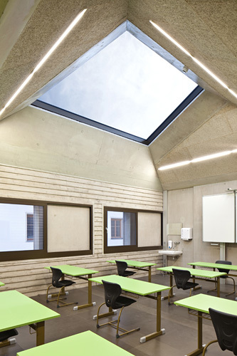 Der prominent im mittelalterlichen Stadtgefüge sitzende Neubau zeigt sich mit seiner Sichtbetonoberfläche dezidiert zeitgenössisch, passt sich durch seine Proportionen und seine sparsame Gliederung aber schlüssig in die Umgebung ein. Zum räumlichen Konzept gehört die geschickte und höchst ökonomische Mehrfachnutzung der Erschließungszone während des Ganztagsbetriebs der Schule. Die Angemessenheit der Mittel ist als Leitbild des Entwurfs direkt erlebbar und lässt trotz aller gestalterischen Disziplin den Spaß nicht außer Acht.