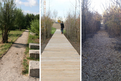 Die Aktivitätsinseln besitzen eine wiedererkennbare Form. Sie stellen einen Anreiz für die funktionsoffene Nutzung der unterschiedlichen Teilräume des Grünzugs dar und reagieren in materieller Hinsicht auf deren Charakter.