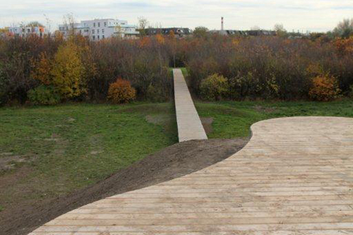 Die 100 m Bahnen bilden in ihrer Linearität und Dimension ein artifizielles Element, das neue Verbindungen innerhalb des Grünzugs und zu seiner Umgebung ermöglicht. Die Ausdehnung über 100 Meter eröffnet einen Bezugsmaßstab innerhalb des Stadtraumes von Stadlau. Die umgebenden Neubaugebiete werden eingebunden, Querungsmöglichkeiten laden zum Erkunden bisher ungenutzter Bereiche ein und ermöglichen neue Blickwinkel.
