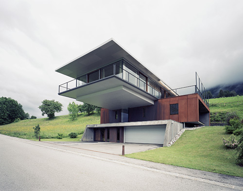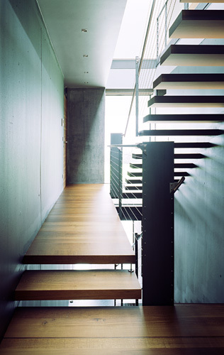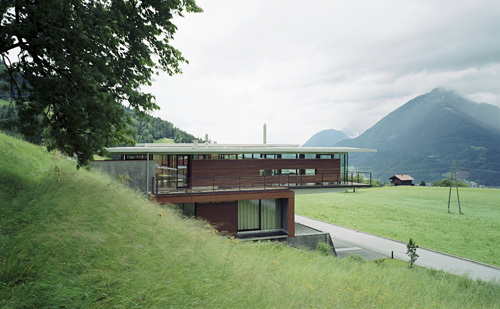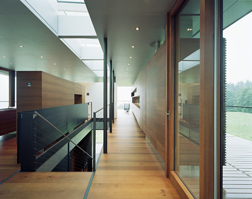 Das oberste Geschoß – die Wohnebene – ist als transparenter schmaler Baukörper in Leichtbauweise ausgebildet, der mit vorgelagerter Terrasse über den Hang hinausschwebt und den Wunsch der Bauherrschaft nach Rundumsicht und freiem Wohngefühl widerspiegelt. Die Fassaden sind hier großteils verglast, eingefügte Eichenholzpaneele bilden zugleich Schrankelemente. Ost- und westseitige Terrassen auf den vorspringenden Teilen des 2. Obergeschoss erweitern die Wohnebene zusätzlich. (Text: Architekt)