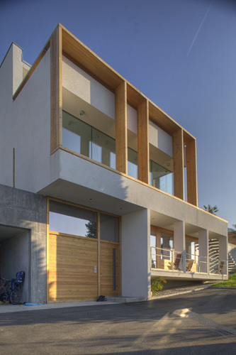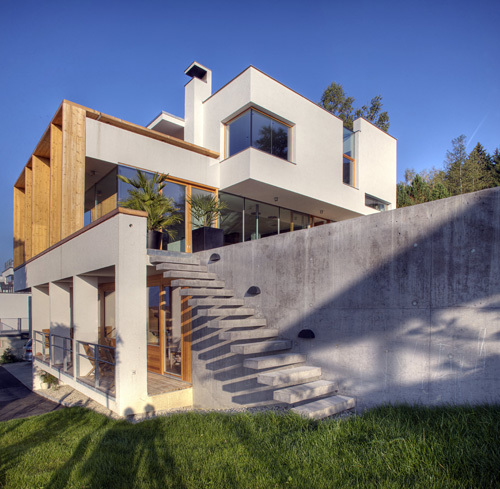 Das äußere Erscheinungsbild wird geprägt durch die weiß verputzen Flächen und die vorgesetzten Holzrahmen, Fenster und Türen in geöltem Lärchenholz. Im Kontrast dazu ist die nordseitige Begrenzungswand der Garage und des Schwimmbads in anthrazit-eingefärbtem Sichtbeton ausgeführt. An der Nordseite bildet die vorgesetzte Konstruktion – im Untergeschoss in rau verputztem Beton und im Erd- und Obergeschoss in Lärchenholz – eine räumliche Struktur, welche das Gebäude abschirmt und den Ausblick in die Natur dennoch freigibt. Sämtliche Möbel sind für das Gebäude und die Benutzer entworfen, verstärken Blickachsen, bilden Räume und schaffen Atmosphäre.
