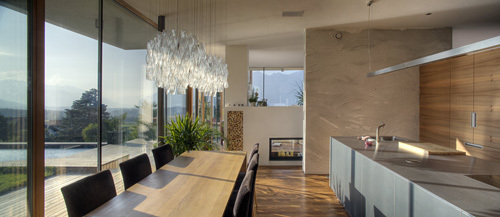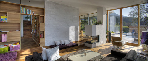 Das Erdgeschoss mit Küche, Essbereich, Bibliothek, Wohn- und Arbeitszimmer bildet ein offenes Raumgefüge. Die einzelnen Bereiche fließen ineinander über und sind doch getrennt, bieten interessante Durchblicke und schaffen doch Intimität. Das um zwei Stufen abgesenkte Wohnzimmer ist an der Nord- und Westseite zum Garten großzügig verglast und bieten einen wunderbaren Ausblick auf die umliegenden Tiroler Berge. Die vorgelagerte, durch das auskragende 1. Obergeschoss überdeckte Terrasse, erweitert den Küchen- und Essraum an der Westseite und geht in den Garten und die Wasserfläche des Freischwimmbeckens über. Im Obergeschoss sind die Rückzugsräume, wie Kinder- und Elternzimmer mit Schrankraum und ein großzügiges Bad mit nordseitiger Terrasse angeordnet.