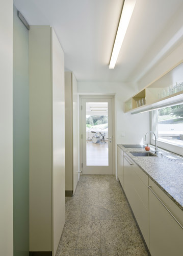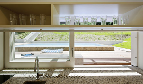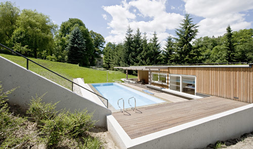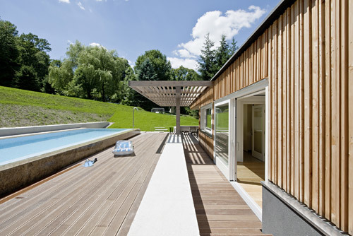 Die kleine Anlage am Fuße der Treppe wird von einer niedrigen Betonbrüstung präzise eingefasst. Mehrere Ebenen in bilden ein interessantes Raumgefüge und erlauben vielseitige Nutzungsvarianten. Zuoberst flankiert eine großzügige Holzterrasse das etwas darunterliegende, langgestreckte und granitverkleidete Wasserbecken. Die Brüstung zwischen der Poolebene und dem Haus dient als Sitzbank und Liege von der einen und als Bar und Ablage von der anderen Seite. Der variabel nutzbare Wohn- Schlafraum öffenet sich mit großen Schiebeelementen ins Freie, auch die Küchenzeile hat durch aufschiebbare Fenster direkten Bezug zur Terrasse und wird wahlweise zur Ausschank.