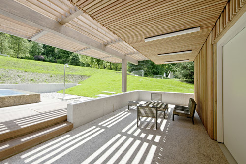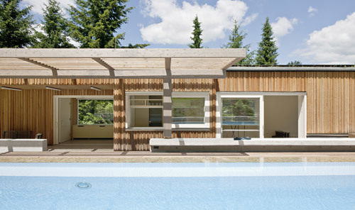 Besonders angenehm ist die Lichtstimmung, die an sonnigen Tagen aus den von der Pergola projizierten Licht- und Schatteneffekten entsteht und in Einklang mit der vertikalen Holzlamellenstruktur der Fassade ein wunderschönes Bild ergibt. (Text: Marion Kuzmany)
