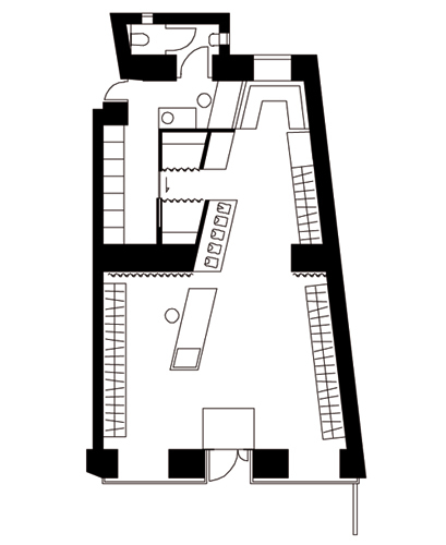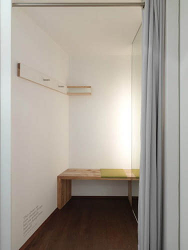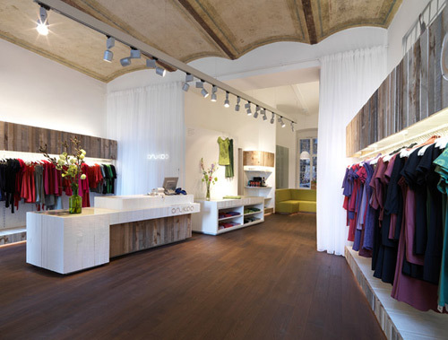 Das leicht trapezförmige Geschäftslokal wurde durch den Einbau einer Zwischenwand, hinter der auf kleinem Raum zwei Umkleiden, Lager und Personal-Infrastruktur untergebracht sind, zur Keilform verdichtet. Verkaufs- und Regalpult führen die Schräge in den vorderen Teil des Geschäfts weiter, während die Seitenwände von Hängeregalen mit den (in dieser Saison hauptsächlich in Rot, Blau, Violett und Grün daherkommenden) Kleidungsstücken eingenommen werden. Unter ihnen werden auf niedrigen Sockeln Taschen, Etuis und Portemonnaies präsentiert. Mit der grünen Mini-Lounge wurde ein mit Kaffeemaschine und Leseecke ausgestatteter Ruhepunkt für urbanes Verweilen unter einem alten Fenster zum Hinterhof geschaffen. Eine halbkugelförmige weiße Deckenlampe sorgt hier zusätzlich für Intimität. Die Öffnung zum Hof erweitert außerdem den nicht besonders großen Raum durch die optische Durchlässigkeit und zweiseitige natürliche Belichtung.