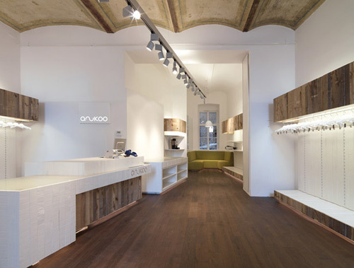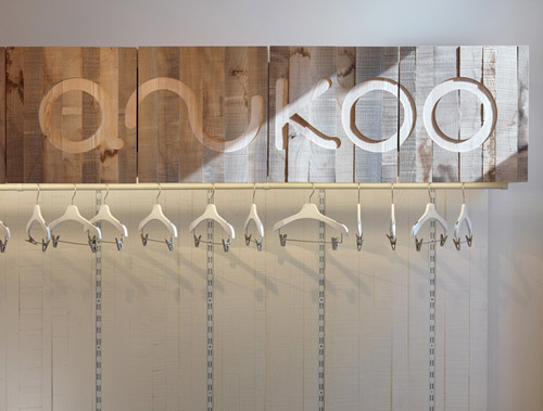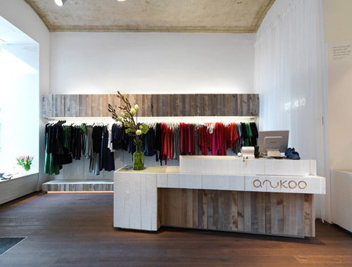 Der Schriftzug des namengebenden Labels Anukoo präsentiert sich außen wie innen dezent als immaterielle Licht-Negativform, wenn er selbst leuchtend an der Fassade und innen an der Stirnwand des vorderen Raumteils (dort hinter weißen Voile-Vorhängen) beziehungsweise als indirekt beleuchtete Aussparung in der Front der hölzernen Verkaufstheke erscheint. Indirektes Licht leuchtet auch unter dem Verkaufspult hervor, während an einer Schiene unter der historischen Decke, an der freigelegte Spuren alter Bemalung sichtbar belassen wurden, montierte Strahler die zu erwerbenden Kleidungsstücke in Szene setzen – deren Preise im Übrigen nicht höher als in den Stores der großen Einkaufsstraßen sind.