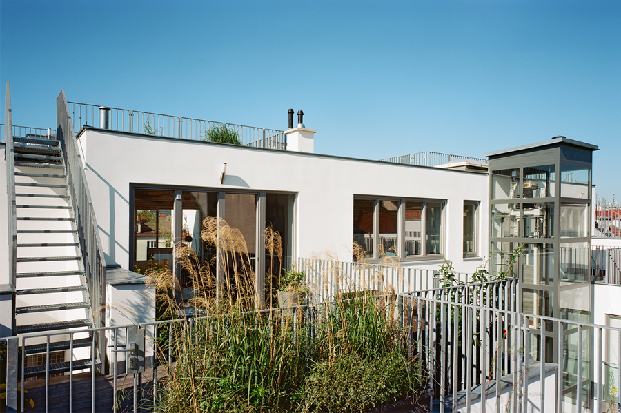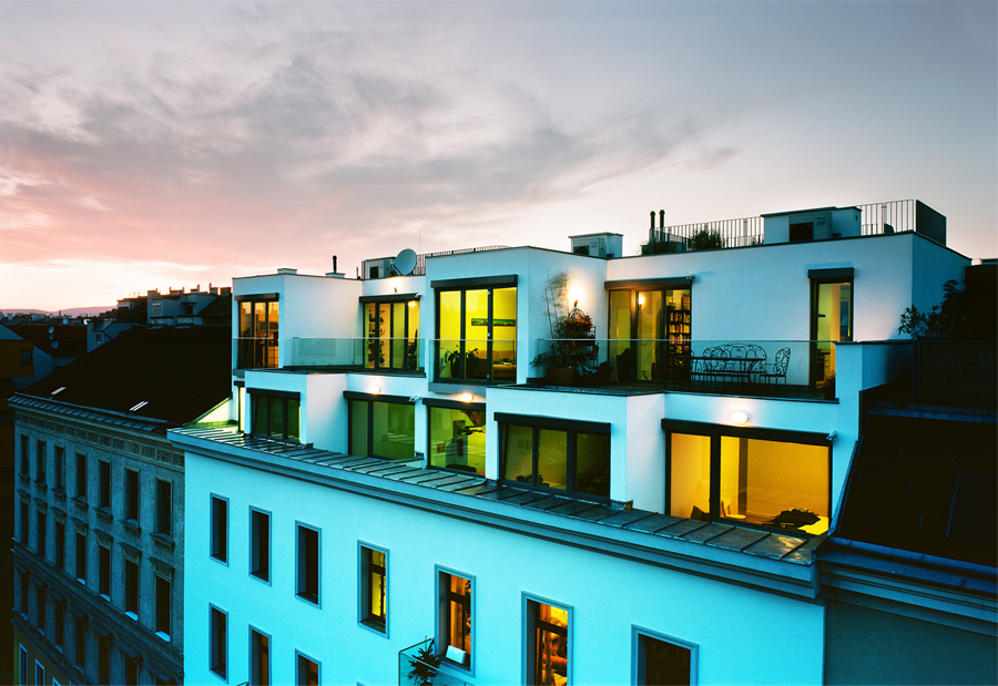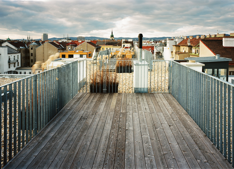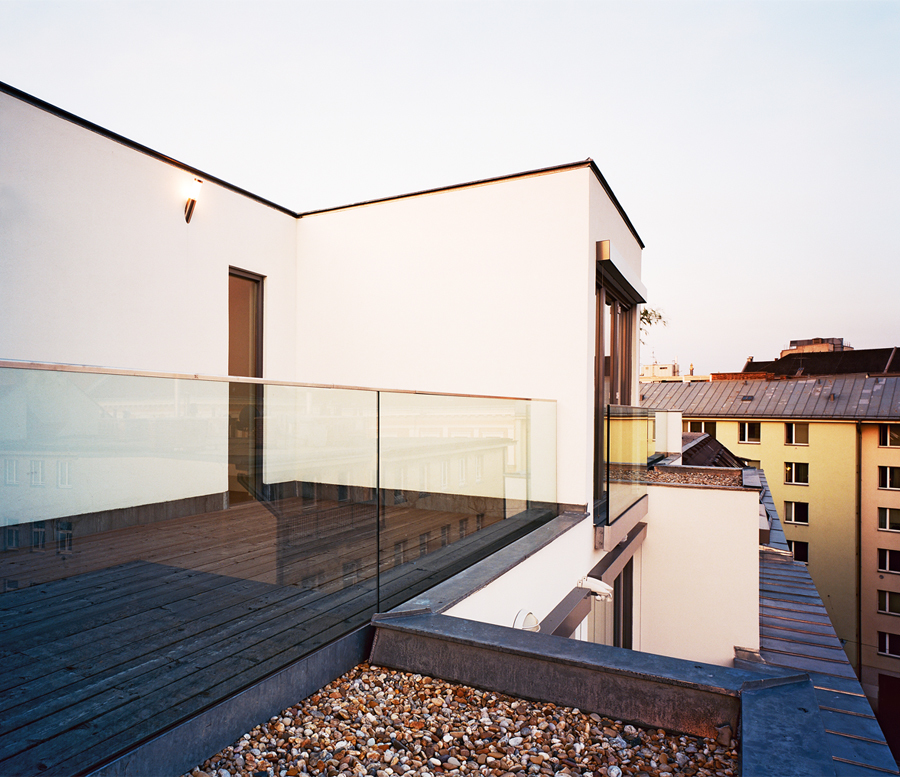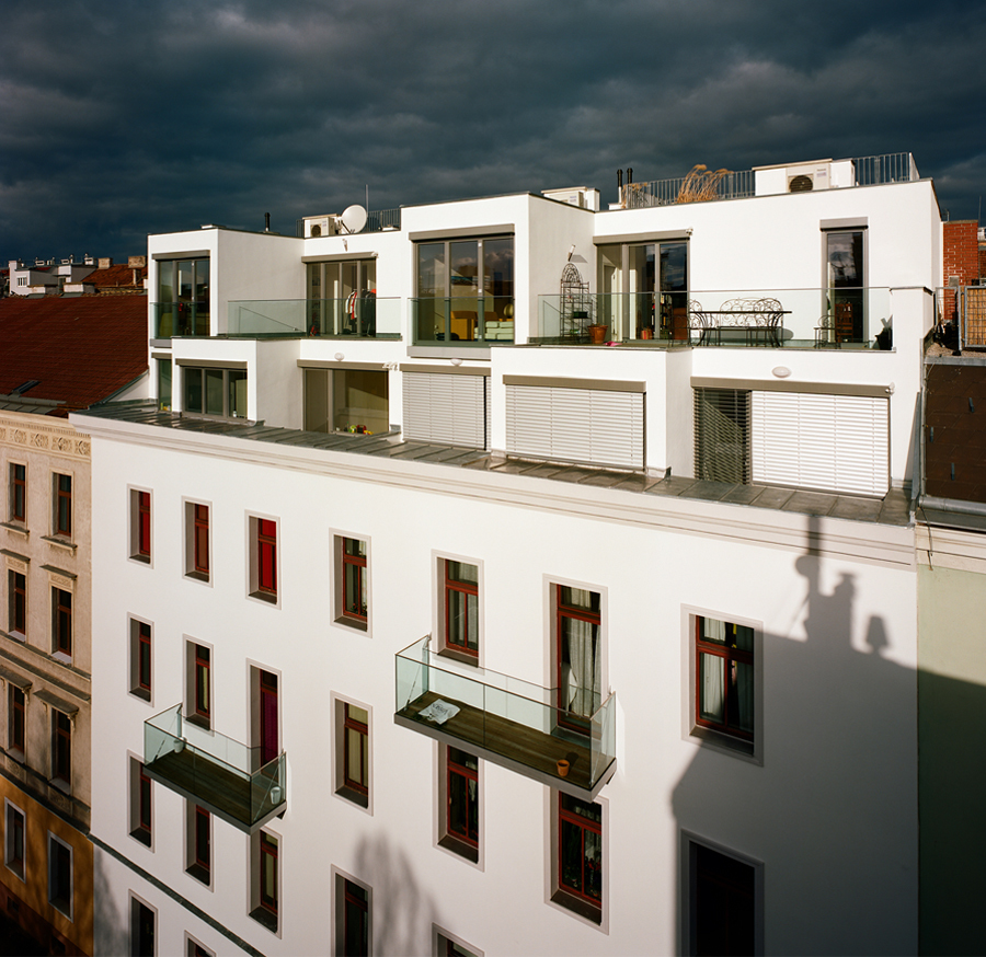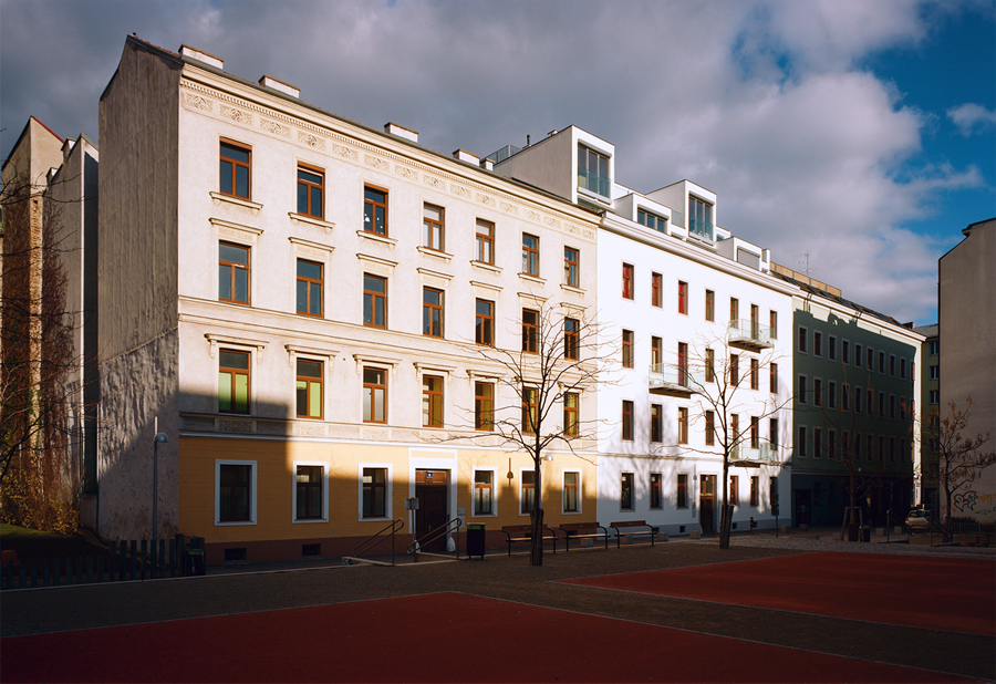 Die Bestandswohnungen der unteren Geschosse erfuhren im Zuge der Gebäudesanierung eine Aufwertung mit straßenseitigen und hofseitig gelegenen Balkonen. Wohnungsbezogene Freiräume über öffentlichem Grund waren in Wien lange Zeit untersagt, die Architekten bemühten sich um eine Ausnahmegenehmigung, die für die Odeongasse auch erteilt wurde. Seit der Planung haben sich die Vorschriften geändert: Balkone, die sich über öffentlichem Grund befinden – zum Beispiel über einem Gehsteig – sind heute bereits genehmigungsfähig. Diese Neuerung stellt eine Chance für den Bestand dar, der sich zwar häufig in attraktiven Lagen in der Stadt befindet, jedoch eklatante Freiraumdefizite aufweist und so gegenüber den Neubauten ins Hintertreffen gerät, zumal geförderte Wohnungen in Wien verpflichtend mit wohnungsbezogenen Freiräumen ausgestattet werden müssen. Das in der Odeongasse heute noch ungewohnt anmutende Erscheinungsbild – Altbauwohnungen mit neu errichteten straßenseitige Balkonen – wird in das Straßenbild Einzug finden und vielleicht bald auch zur Norm werden. (Text: Martina Frühwirth)