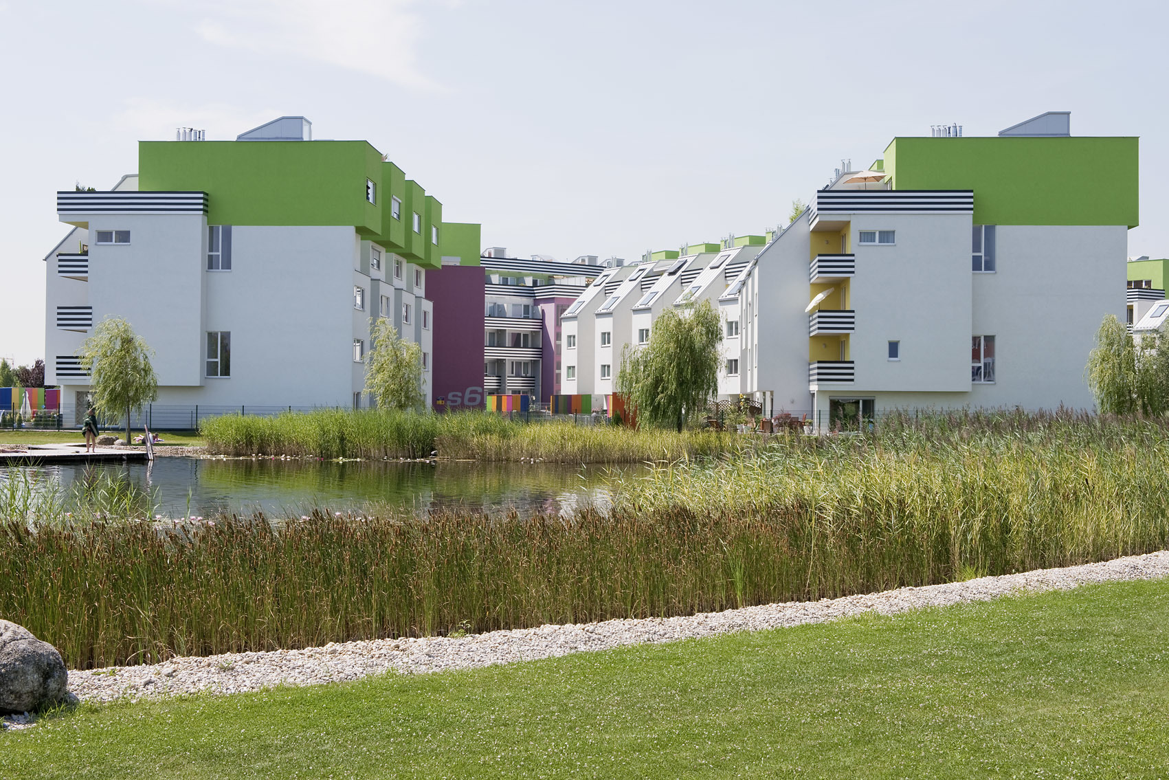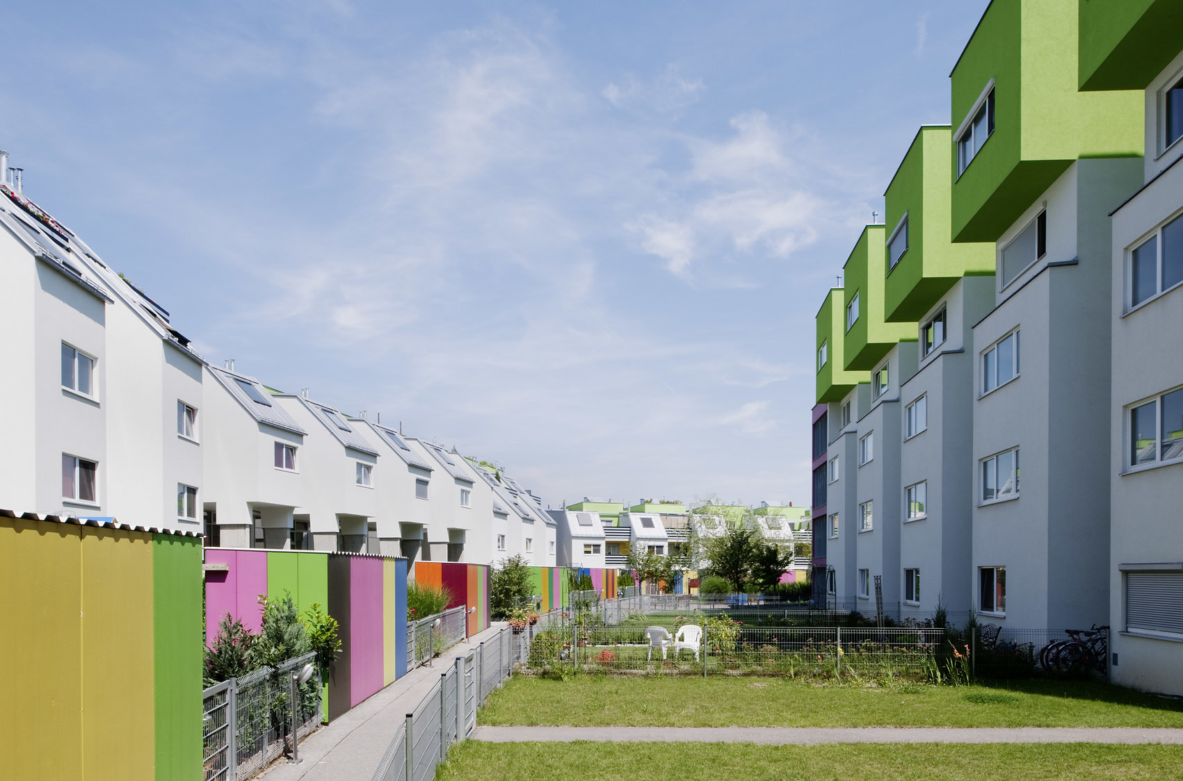Eine Bandbreite von insgesamt 18 verschiedenen Wohnungstypen (11 Geschosswohnungen, 7 Maisonettentypen) bietet jeweils eigene Qualitäten: Gartenmaisonetten, Gartenwohnungen, durchgesteckte Maisonetten mit aussenliegenden Bädern. Der Großteil der Wohneinheiten sind Maisonetten, diese werden von Laubengängen, Innengängen oder direkt von außen erschlossen. alle Wohnungen sind mit Gärten, Balkonen, Terrassen, Loggien oder Dachterrassen ausgestattet.