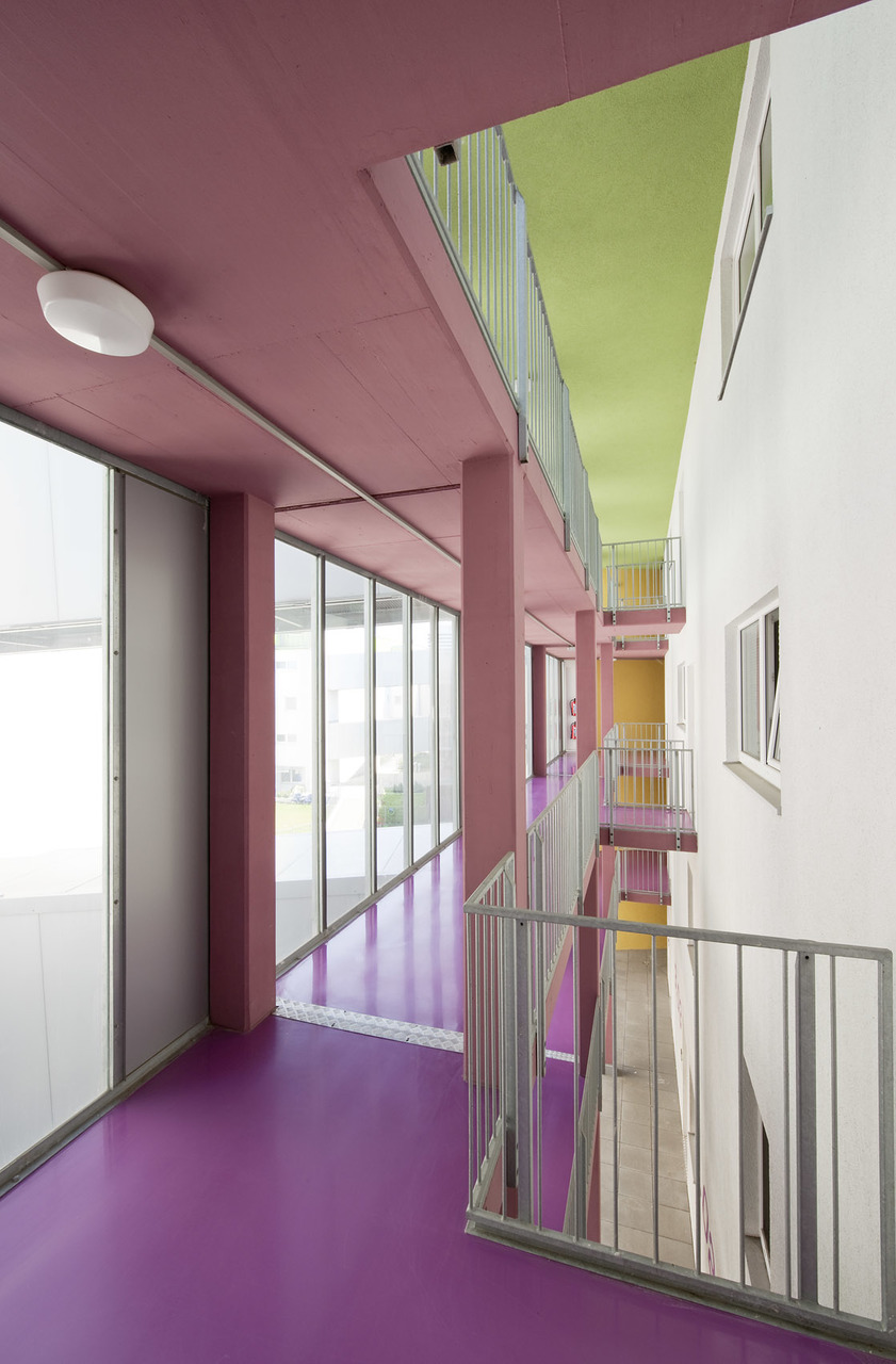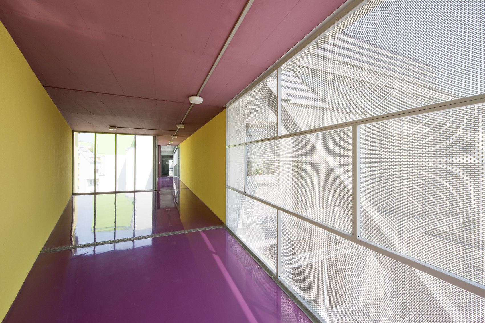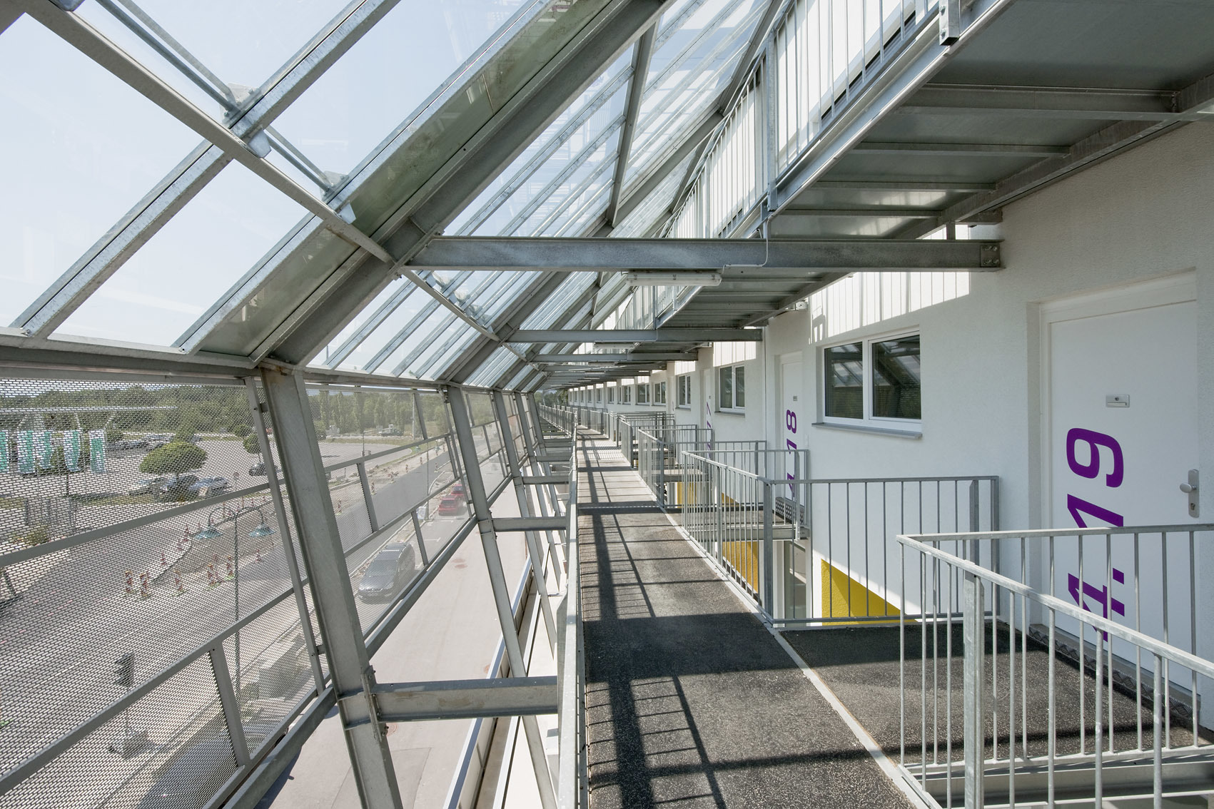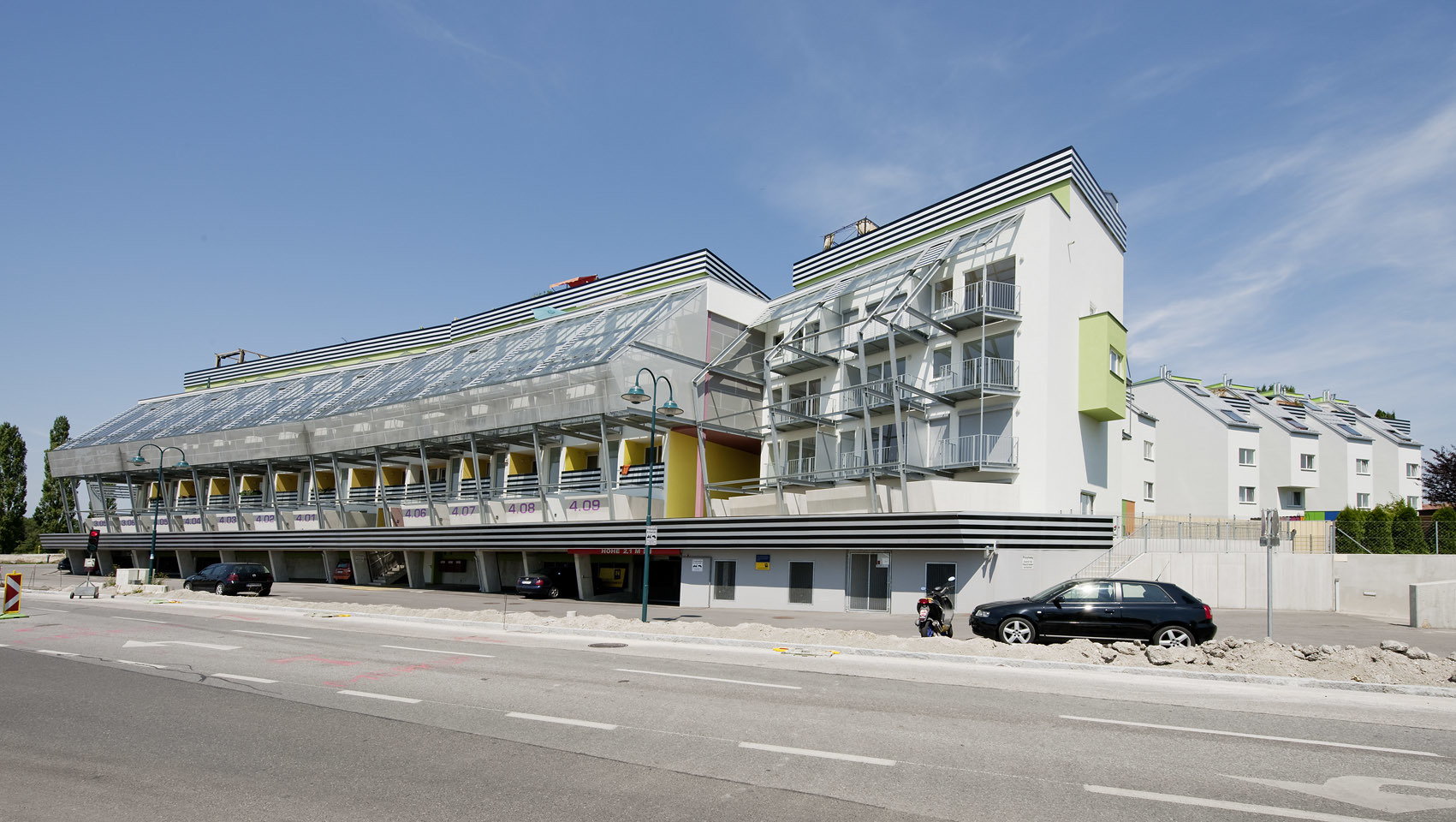 Der südliche Bauteil an der Maria Lanzendorfer Strasse bietet sowohl Maisonetten als auch Geschosswohnungen in Nord-Süd-Ausrichtung, die vom Fernblick bis hin zum Schneeberg profitieren und gleichzeitig durch eine geräumige Stahl-Glas-Konstruktion mit Laubengängen vor Verkehrslärm geschützt werden.