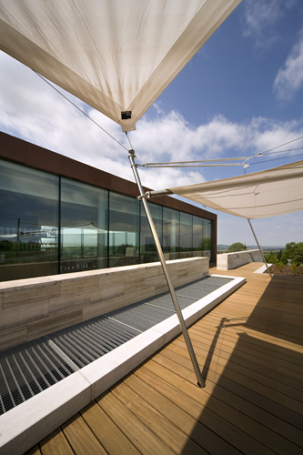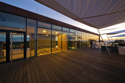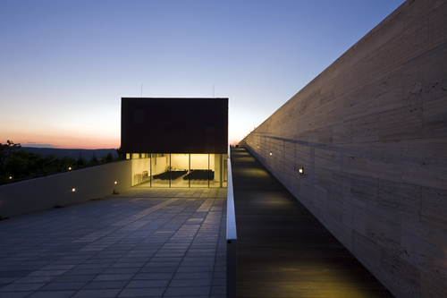 The service areas are on the lower floor to enhance the transparent and flexible utilization of the upper floor: the a la carte and the buffet restaurant are floating above the hill overlooking the valley.
