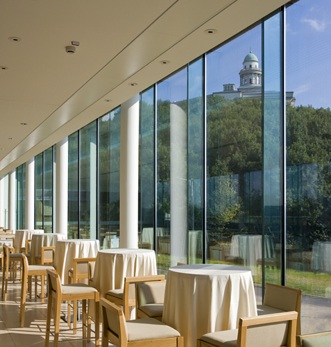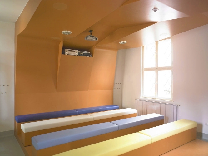 The visitor centre is a two-storey building but the lower floor is hidden by the hill therefore only the transparent glass façade of the upper floor is visible from a distance. This innovation ensures that the building is well proportioned to both the hill and the reception building, and well suited to the environment. The rehabilitation of the Kosaras Hill - the restoration of its natural environment - covers the parking area, the bicycle and luggage stores, which are hidden from view as you arrive and are also concealed when viewed from either the Arch-abbey or from the valley. The visitor centre is surrounded by a one-way road, which leads the tourists’ cars and buses to this backside area. The conference hall on the lower floor has a capacity for 120 guests, which gives the opportunity to host a wide variety of events.