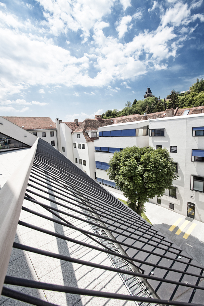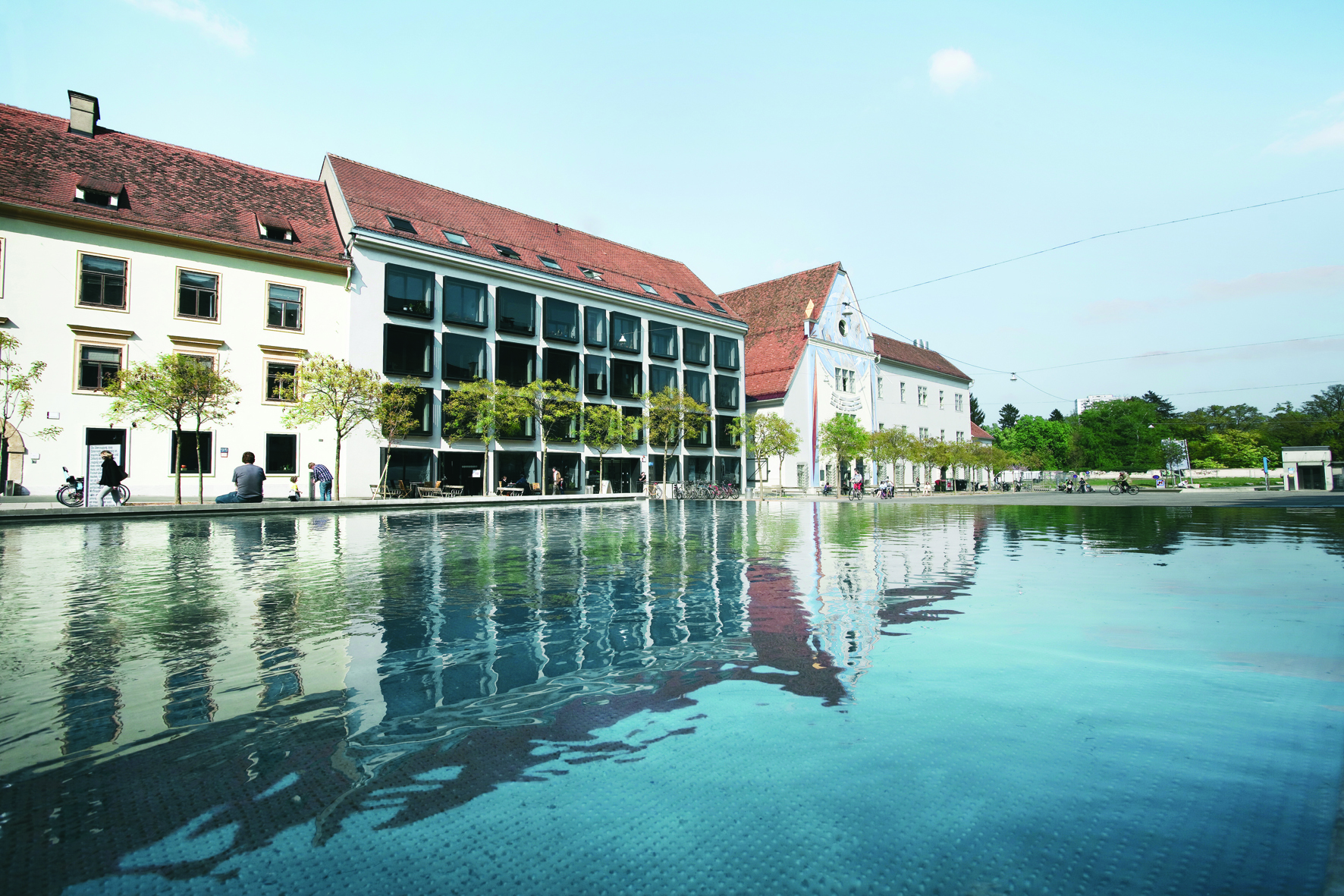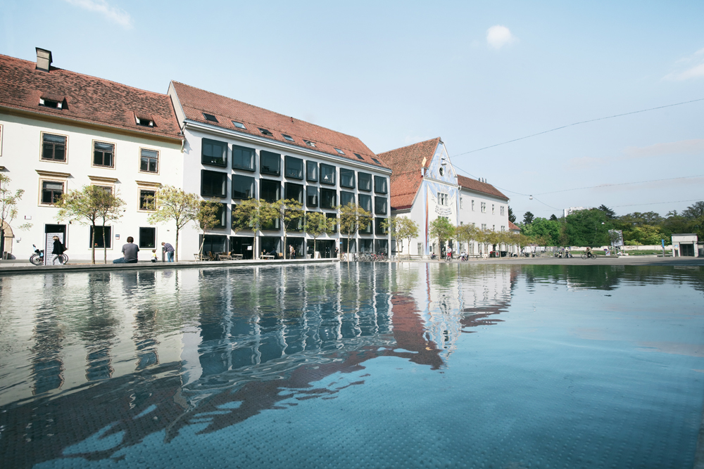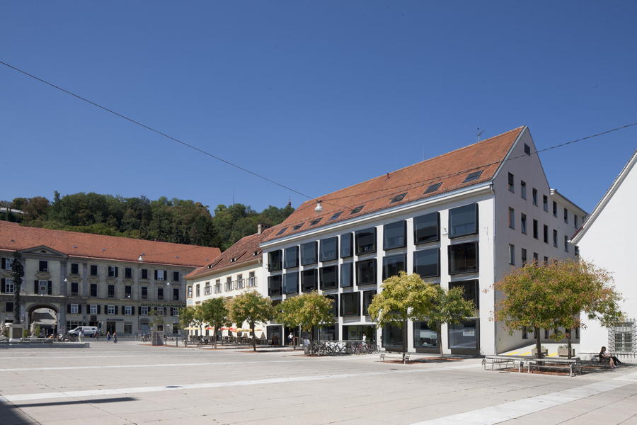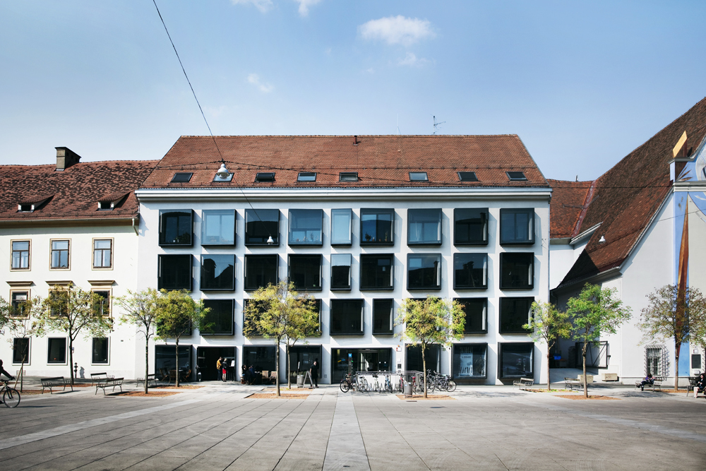 Eine weitere wesentliche Maßnahme ist der Umbau der Fassade des Hauses Karmeliterplatz 2 zum Karmeliterplatz. Die Grazer Tradition der dreidimensionalen, „bewegten Fassaden“, die mittels Putzplattentechnik und dem typischen Grazerstock-Fenster hergestellt wurden, wird für dieses Projekt inmitten der Grazer Altstadt zum Ausgangspunkt für die Neugestaltung und mit zeitgemäßen Mitteln neu interpretiert: Die raumhohen Kastenfensterelemente - sie sind zur Fassadenebene leicht gedreht vor die Fassade montiert - orientieren sich zur Stadt und spiegeln abwechselnd den Platz und die umliegenden Häuserfronten in unterschiedlicher Brechung wider. Insbesondere in der Bewegung auf dem neu gestalteten Karmeliterplatz zeigt sich dadurch eine Dynamik, die vergleichbar mit der rhythmischen Einheit und detaillierten Vielfalt der traditionellen Vorbilder wird.