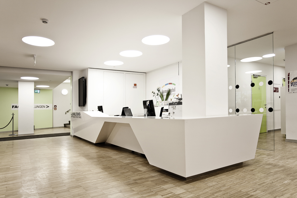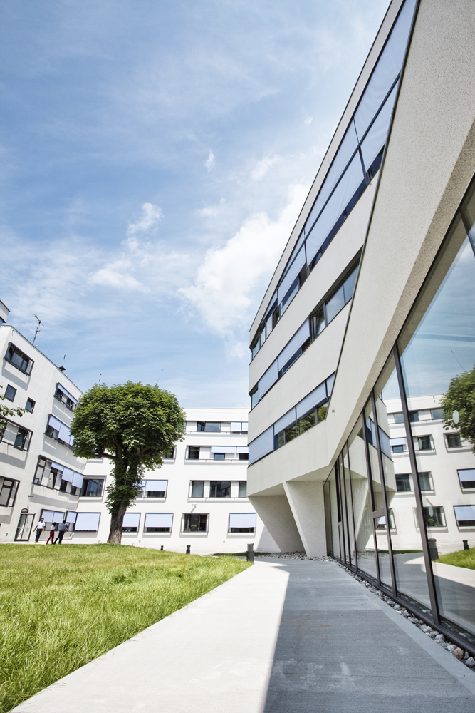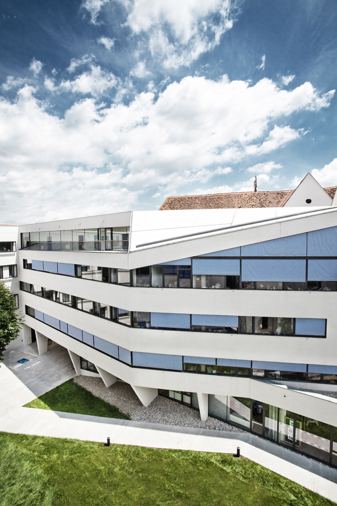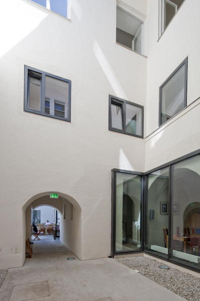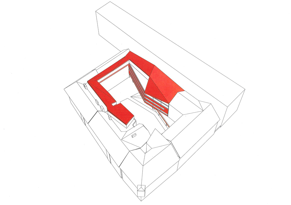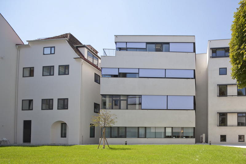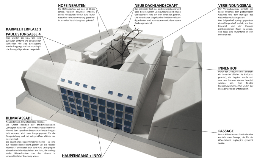 Die Grundidee besteht darin, drei vorhandene Gebäude, die bereits untereinander verbunden sind und gemeinsam genutzt werden, durch einen Baukörper zu einem Ring zu schließen. Dieser Baukörper, der gestalterisch eine selbstbewusste Sprache spricht, steht in spannendem Dialog mit dem Bestand. Das Gebäude-Passstück schließt die Lücke und behebt die funktionellen und gestalterischen Mängel an den bestehenden Gebäuden. Historische Erhebungen der Gebäude-Entwicklungen am Karmeliterplatz haben ergeben, dass diese Gebäudeformation bereits im 17.Jhd bis ins mittlere 20.Jhd. bestand. Eine früher bestehende Gasse wurde durch Abbruch eines Gebäudeteiles am Karmeliterplatz wieder zu diesem hin geöffnet.