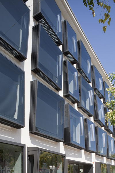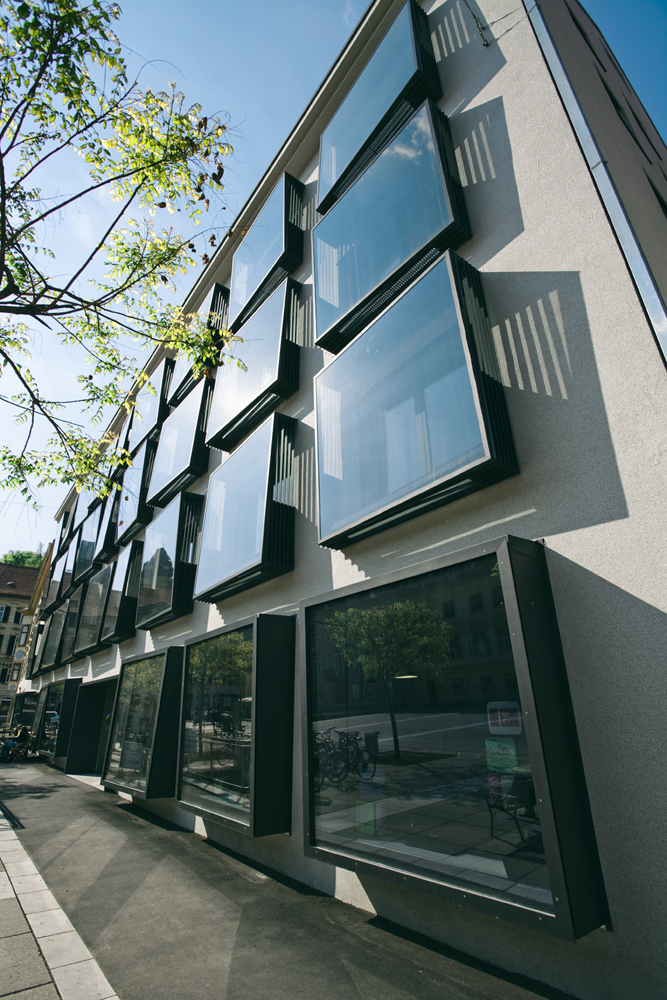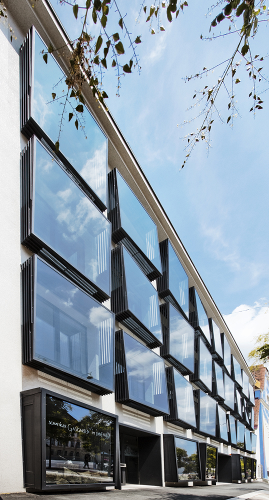Technisch betrachtet handelt es sich bei der Fassade um eine Kasten-Doppelfassade mit einer fixverglasten Front aus Sonnenschutzglas und einen umlaufenden Rahmen, der am Fußpunkt und an den Seiten Lüftungsöffnungen aufweist. Zum Innenraum hin sind Schiebetüren angebracht, die den eigentlichen Raumabschluss herstellen. Durch die in der Nacht offenen Schiebetürflügel ergibt sich ein natürlicher Luftaustausch, der durch eine mechanische Nacht-Entlüftung der Räume unterstützt wird und zu einer sehr effektiven Abkühlung der Räume führt. In der Praxis hat sich gezeigt, dass es zu keiner sommerlichen Überwärmung mehr kommt und über den ganzen Tag ein sehr angenehmes Arbeitsklima herrscht. Zusätzlich wird die Doppelfassade als Wintergarten verwendet und von den Nutzern mit Pflanzen ausgestattet. Auch im Winter verbessert die Doppelfassade die Energiebilanz durch Nutzung des Sonnenwärmeeintrages tagsüber und durch verminderten Wärmeverlust in der Nacht.
