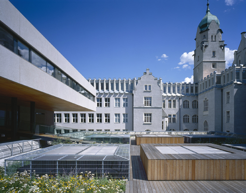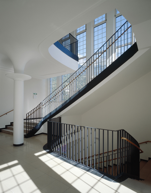 Das in seinem Erscheinungsbild und in seiner Substanz erhaltene Bestandsgebäude erfuhr eine sog. „Funktionssanierung“ – brandschutztechnische Mängel wurden behoben sowie die gesamte Gebäudetechnik erneuert. Die Unterrichtsräume im Altbau erhielten abgehängte Akustikdecken und neue Bodenbeläge, der große Festsaal und die Kreuzgewölbe der Gänge wurden in Abstimmung mit dem Denkmalamt restauriert. (Text: Claudia Wedekind)