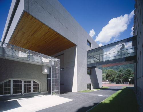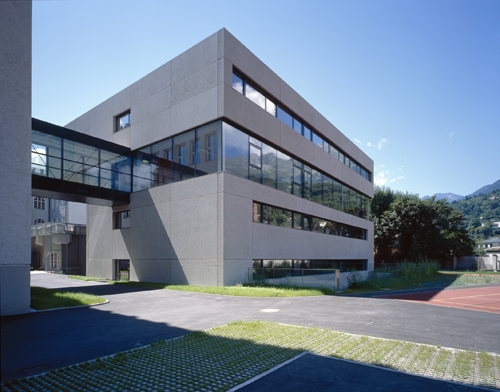 Die Grundidee ihres Entwurfs bestand darin, nördlich der bestehenden Turnhalle und von dieser deutlich abgesetzt einen fünfgeschossigen Baukörper zu positionieren, dessen oberste Ebene über die Turnhalle auskragt. Darunter befindet sich eine geschützte Freifläche, von der aus eine Rampe auf das Dach der Turnhalle führt, das begrünt und als Pausenfläche nutzbar gemacht wurde.
