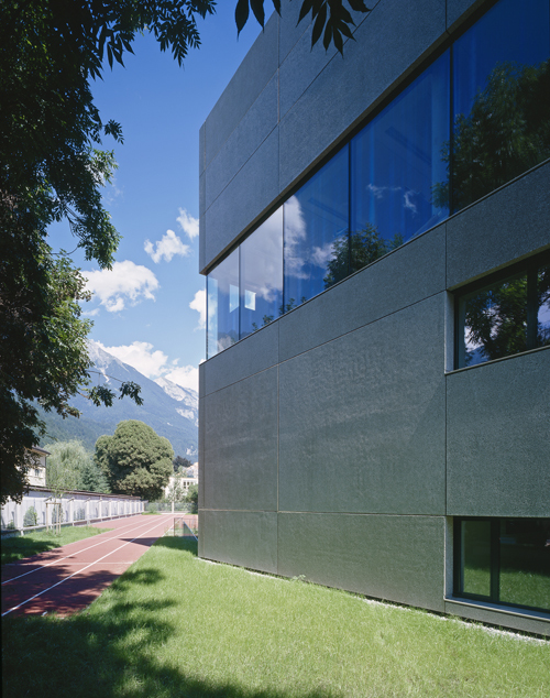 Das Anfang des 20. Jahrhunderts von den aus München stammenden Architekten Arthur Ringler und Eduard Klingler im Innsbrucker Saggen errichtete Schulgebäude ist ein typisches Beispiel der sogenannten „Tiroler Gotik“. In den 1970er Jahren wurde der denkmalgeschützte Bau durch Ekkehard Hörmann um einen gerüstartigen, aus der Struktur der alten Fassade entwickelten Aufbau aufgestockt.Für die notwendig gewordene Erweiterung der Bundeshandelsakademie und Bundeshandelsschule wurde 2004 ein Architekturwettbewerb ausgeschrieben, den Daniela Amann und Florian Lutz mit ihrem Konzept eines Solitärs gewinnen konnten, der in seiner ruhigen und monolithischen Gestaltung einen klaren Kontrapunkt zur Feingliedrigkeit des Bestands setzt.