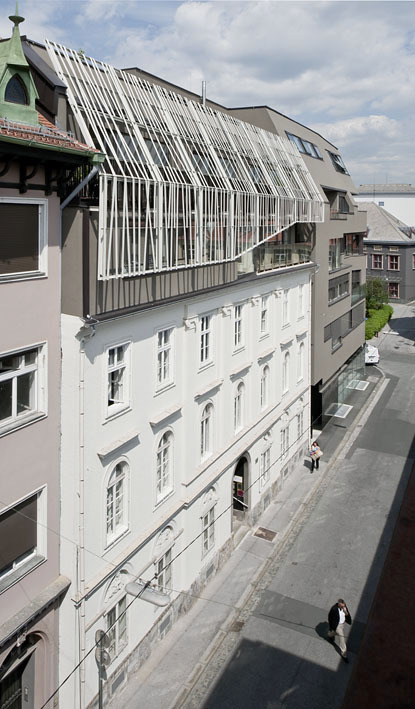 Das gründerzeitliche Wohnhaus St. Georgengasse 7 wurde saniert und die ehemalige Dachgeschoßebene durch eine dreigeschoßige Überbauung zum Bestandteil des Neubaus umfunktioniert, so dass es sich homogen in das Straßengefüge einpasst. Der aufgesetzte Neubau wurde mit einem Grid versehen, das die Fassadenfarbe des Altbestands aufgreift. Bei den oberen zwei Geschoßen des Neubaus ist die Fassade leicht zurückgesetzt, um den Bau nicht zu massiv erscheinen zu lassen. Das Erdgeschoß ist komplett verglast, wodurch das Gebäude zu schweben scheint.