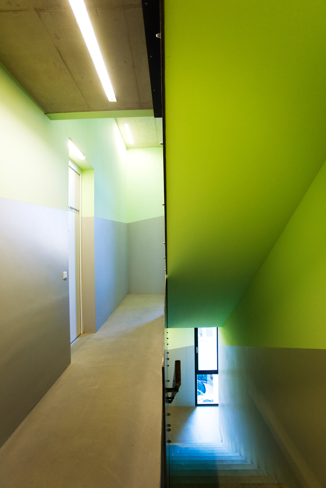 Wo früher eine durchgehende Bebauung bis zur Straße vorherrschte, ist ein grüner Innenhof mit einem eingeschoßigen Gebäude entstanden. Das bestehende Atelierhaus wurde saniert und steht nun als Solitär im Hof.