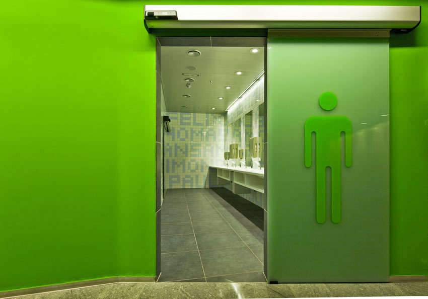 Der rechteckige, schlichte Baukörper bietet nach Norden hin eine elegante aufwändige Fassade – wie von Hand gewebt, die das Himmelslicht wechselhaft widerspiegelt. Diese silberngraue Stickerei ist durch Eingänge und verglaste Fassadenöffnungen aufgelockert und regt zur Entdeckung der Innenwelt an. Durch die unterschiedliche Dichte der Edelstahlgewebe erscheinen die Fassadenfelder verschieden hell und unterschiedlich tief – eine Wirkung, die man an einem sommerlichen Wolkenhimmel beobachten kann. Um das Zufällige des Himmels wiedergeben zu können, wurde eine bestimmte, zufällig erscheinende Wolkenmatrix konzipiert, die neun unterschiedlich dichte Edelstahlgewebe in 11 Schichten ordnet, je höher desto lockerer, wie eben Wolken am Sommerhimmel. Farbige Verkleidungen am Tag und farbiges Licht bei Nacht sowie eine lange bunte Shoplogo-Zeile bringen das Thema „Bunter Shoppen“ in die Fassade.
