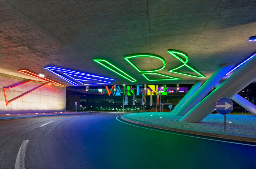 „Varena“ liegt am Stadtrand, optimal an der Bundesstraße B1 und nur einige Kilometer von der Westautobahn entfernt, in einer Senke, und bildet den modernen Gegenpol zum historischen Stadtkern von Vöcklabruck. Die aufwändige Verkehrserschließung von allen Richtungen, inklusive Kreisverkehr unter der bestehenden Bundesstraße mit An- und Ausfahrtsrampen, einer Brücke und Brückenverbreiterung ermöglicht eine reibungslose und flüssige Zu- und Abfahrt sowie eine selbsterklärende, bequeme Nutzung der auf drei Ebenen verteilten, überbreiten 1900 Kundenabstellplätze. Das offene Parkdeck bildet den 8 m hohen Sockel, auf dem das Shopping Center steht. Der Vorplatz befindet sich somit in gleicher Höhenlage wie die Bundesstraße und ermöglicht den Vorbeifahrenden eine optimale Wahrnehmung des Centers. Eine Reihe von zehn 13 m hohen farbigen Lichtstelen entlang der Straße bringt das Thema „Bunter Shoppen“ zum Ausdruck.