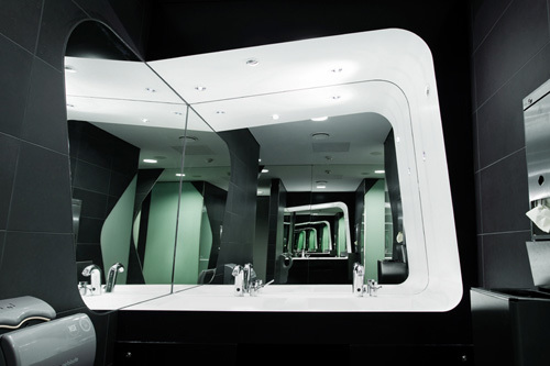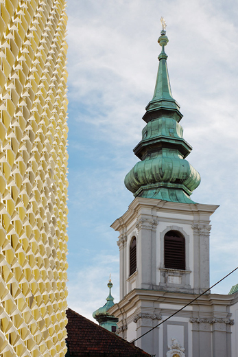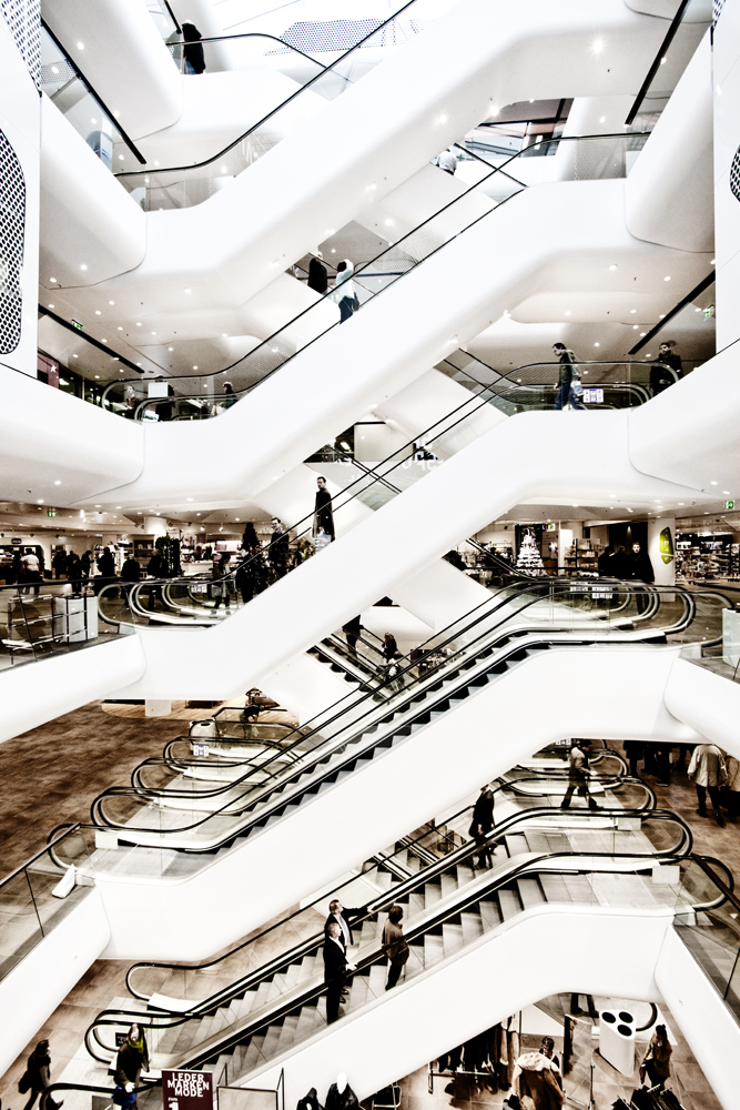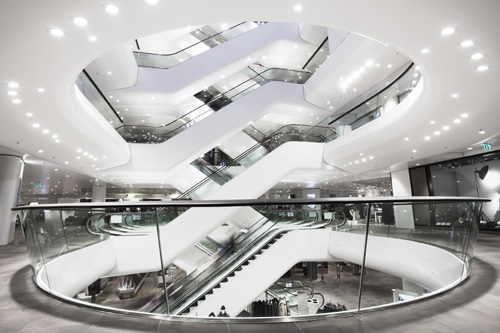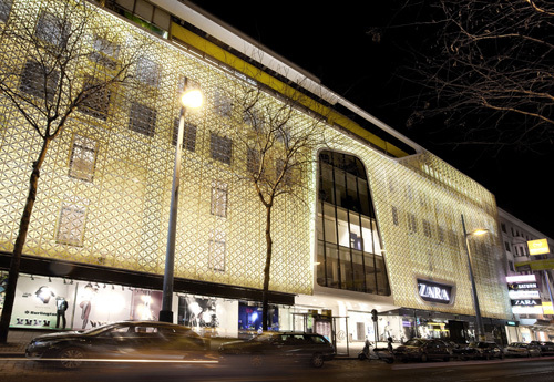 Die einzelnen Shops sind schollenartig in den Etagen des Hauses verteilt. Diese Schollen sind durch Wechsel in den Bodenbelägen und durch Materialwechsel in den Deckenbereichen gekennzeichnet und bilden so das sternförmige Wegekonzept in Decke und Boden ab. Die schollenartige Struktur des Innenraumes setzt sich auch auf der neuen Fassade des Gerngross fort. Zu diesem Zweck wurden großformatige, amorphe Farbflächen auf der Fassade aufgebracht, davor befindet sich eine ornamental gestaltete, semitransparente weiße Fläche. Gemeinsam bilden diese Ebenen ein Volumen aus Licht und Farbe. Dieser Effekt wird am Abend durch ein Beleuchtungskonzept zwischen den beiden Schichten der Fassade unterstützt. Betrachter werden die Fassade - je nach Standort und Perspektive - verschieden wahrnehmen: bei einem flachen Blickwinkel erscheint sie eher als weiß-ornamentiertes Feld, je steiler der Blickwinkel wird, desto stärker kommt die Hintergrundfarbe des Hauses zur Geltung. Dadurch entsteht eine Art Kippeffekt, welcher den Passanten begleitet. Die neue Fassade verleiht dem Gebäude ein für Wien ungewohntes, weil frisches Gesicht. Shoppingarchitektur, wie man sie bislang auf der Shoppingmeile Omote-Sando in Tokyo finden konnte, hat jetzt auch ihren Platz in Wien gefunden. (Text Architekten, redaktionall überarbeitet und erweitert, Martina Frühwirth)