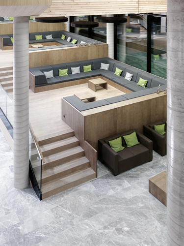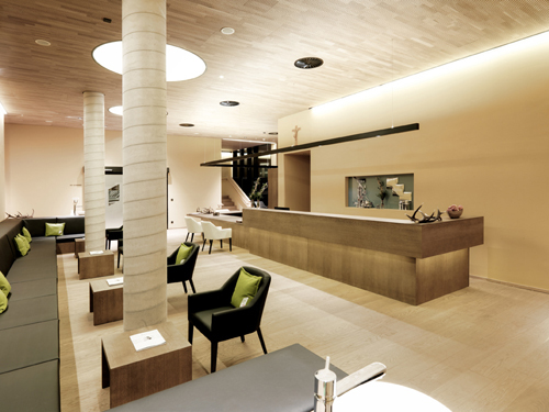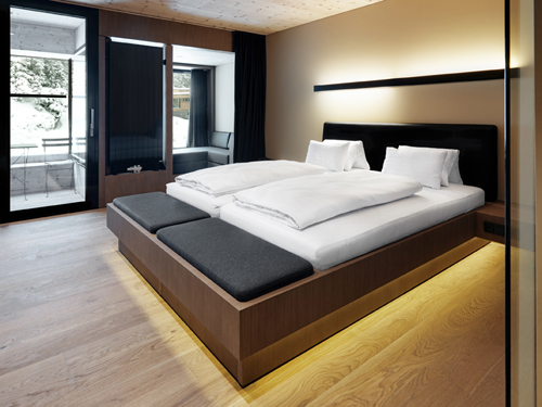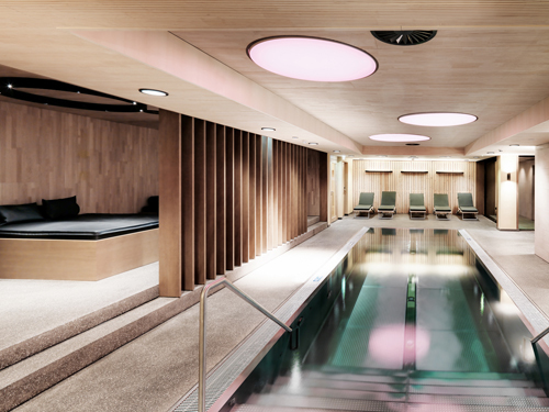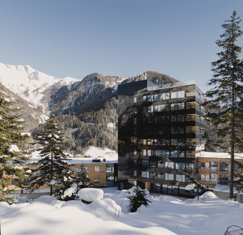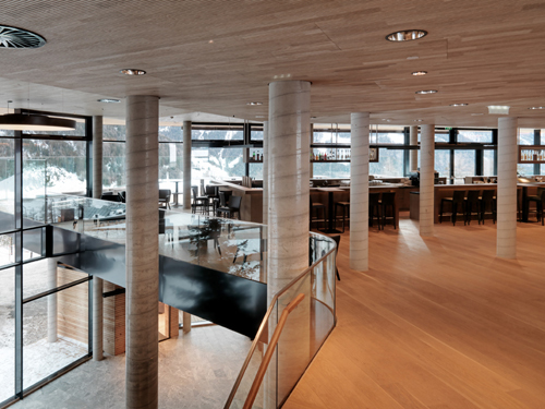 Der abgewinkelte, längliche Baukörper des Hotels besteht aus zwei transparent gehaltenen, öffentlichen Geschossen, dem darüber liegenden hölzernen Zimmertrakt sowie einem weithin sichtbaren Turm mit exklusiven Suiten. Um die zum Teil dreigeschossige Eingangshalle gruppieren sich Bar, Seminarbereich, Speisesaal und Restaurant mit großer Terrasse, Geschäfte für den täglichen Bedarf sowie ein Sportshop. Eine Wellness-, Bade- und Saunalandschaft mit vier Pools ergänzt das hochwertige Hotelangebot. Eine Tiefgarage sorgt dafür, dass das gesamte Resort weitgehend autofrei ist.