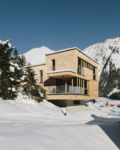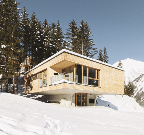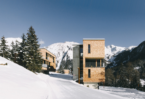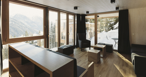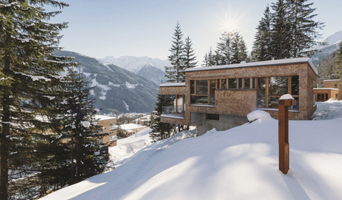 Die Châlets wurden in fünf verschiedenen Typen – Platte, Splitlevel, Turm, Würfel, Luxus – aus der Geländesituation entwickelt. Sie sitzen auf pilzförmigen Betonsockeln, ihre kubische Form reagiert auf die Hangneigung. Die Schindelfassade aus Lärchenholz der vollständig aus massiven Brettsperrholz bestehenden Häuser wird im Lauf der Zeit verwittern, was dazu beiträgt, dass sich die baulichen Eingriffe in den Kontext integrieren. An Wänden, Decken und Treppen bleibt das Konstruktionsholz sichtbar, eine leicht weiß pigmentierte Natur-Öl-Lasur lässt die Holzstruktur durchschimmern und veredelt das Material.