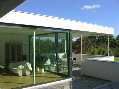 Als die Fundamente fast fertig waren, kam das Jahrhunderthochwasser. Nun ist nicht nur der Keller, sondern auch das Erdgeschoß bis zu einem Meter aus wasserundurchlässigem Beton, alle Fensterparapete setzen hier an. Die Betonbodenplatte im Hof ist 50 cm dick, um nicht aufzuschwimmen, die überdachte Südterrasse ummauert. Sie wirkt wie eine riesige, offene Loggia. Auch der Hof hat eine Mauer, ihr Gartendurchgang ist wie Haus und Garage mit Hochwasserschutzbarrieren abzuschotten. Im Ernstfall befördert die Dieselpumpe im Hof das Regenwasser in die Donau.