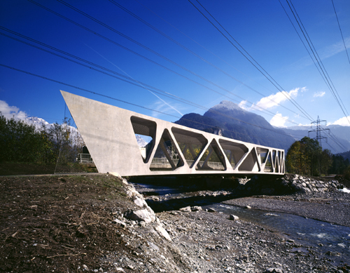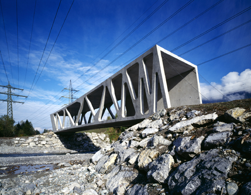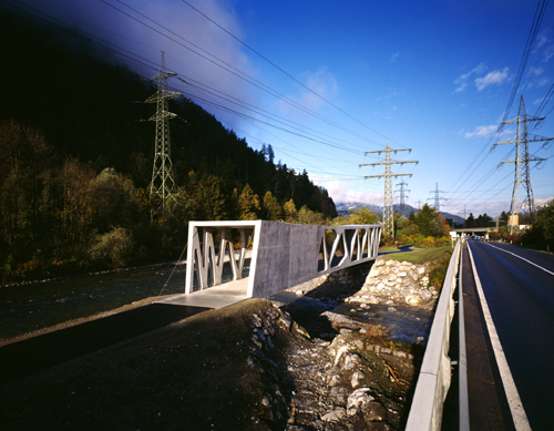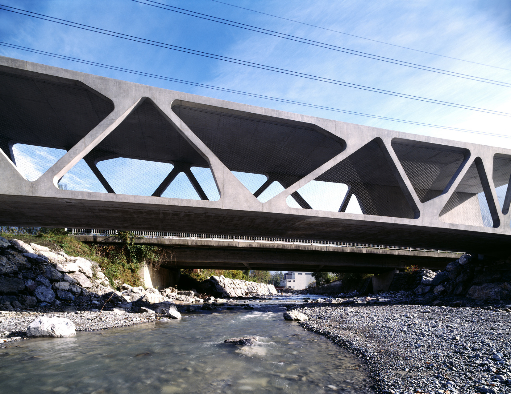 Der Taleingang zum Montafon erfolgt über ein topografisches Nadelöhr, den Passanten bieten Eisenbahn, Bundesstraße und der neugeschaffene Radweg Zugang zur südlichsten, von hochalpinen Gebirgszügen umgebenen Talschaft Vorarlbergs. Parallel bahnt sich die reißende, hochwassergefährdete Ill ihren Weg, von Osten kreuzt die Alfenz und leitet die Gewässer in ihre Bahnen. Wenige Meter vor der Einmündung überspannt das neu geschaffene Brückentragwerk aus Beton den Zubringer und gewährt dem Spaziergänger und Radfahrer den sicheren Übertritt. Eine untenliegende Tragkonstruktion ist auf Grund der Geländeanbindung und dem geforderten Hochwasserschutz nicht möglich, die Lösung bringt eine gedeckte Brücke mit Tragwirkung über die Längsseiten. In Anlehnung an bionische Prinzipien formen unregelmäßig angeordnete diagonale Zug- und Druckstäbe, an den Enden jeweils der Kraftableitung entsprechend verstärkt, ein durchlässiges Brückenhaus. Der stark befahrenen Straße wird durch mehr Wandanteil Rechnung getragen, zur Ill hin eröffnet das aufgelockerte Fachwerk den Blick zum Naturraum. So reagiert die statische Wandscheibe mittels unterschiedlich großen Öffnungsanteilen auf Umgebungseinflüsse und Kraftverläufe. Charakter und Gesamterscheinung resultieren dem zu Folge aus statischer Logik und Effizienz in der Materialisierung. Die Radwegverbindung Bludenz-Schruns wird im wahrsten Sinne des Wortes „massiv“ aufgewertet, denn die Brücke setzt durch ihre gestalterische Prägnanz einen kaum zu übersehenden Meilenstein im Netz der autofreien Mobilität.Text: Marina Hämmerle
