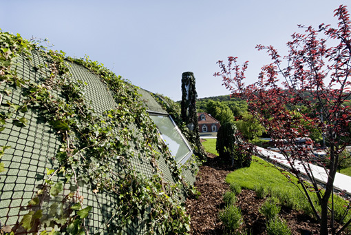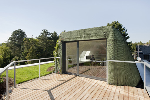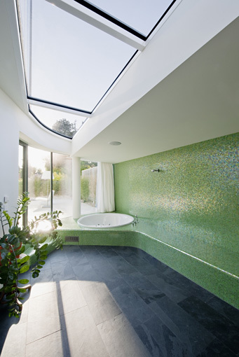 Als Leitmotiv für den Entwurf dient die Schwingung: Eine „Schwingungsbewegung“ vereint den Wohn- und Essbereich im Erdgeschoss mit dem Garten und bildet ein 500m² großes Wohnzimmer, bestehend aus Freiraum und Innenraumbereichen. Das Motiv setzt sich mit Sitzgruben und geschwungenen Möbeleinbauten im Wohnraum sowie runden Pool- und Terrassenformen im Garten fort. Eine Fassade aus semitransparenten Polycarbonatelementen, gepaart mit luftig wehenden Vorhängen, bildet einen fließenden Übergang vom Wohnraum in den Freiraum, der Traum vom 500 m² Wohnzimmer ist Wirklichkeit geworden. (Text Architekten, redaktionell überarbeitet)