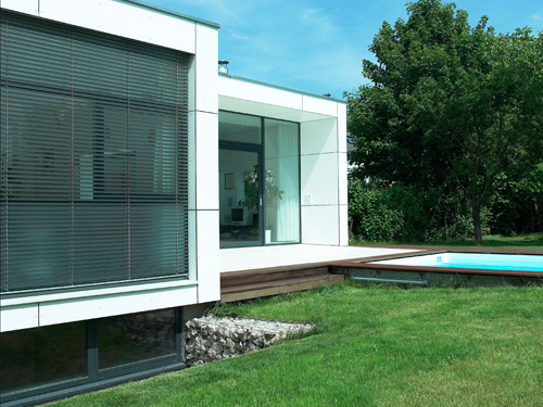 Die Umgebung bietet keinen attraktiven Anblick, das Haus orientiert sich zum Garten, fasst wie ein schützender Haken L-förmig die große Terrasse ein, die elegant den anschließenden Pool rahmt. Kein einziger, liebevoll gehegter Apfel-, Birnen-, Zwetschken- oder Nussbaum musste fallen. Nur der mächtige Ahorn wurde verpflanzt, bietet einen schönen Ausblick und schützt (Sonnen-)Badende vor neugierigen Blicken.