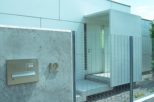 Das Gelände wurde in Höhe der Sockelzone abgegraben. Zwei Stützwände aus groben Steinen, von einem Gitter in präzise Geometrie gefasst, lassen die lichtspendende Maßnahme im Garten elegant in Erscheinung treten.
