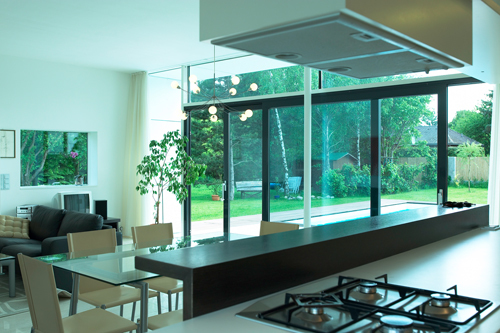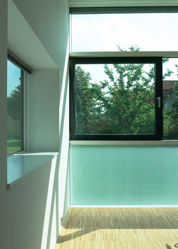 Der Eingang ist im Westen, durch eine Glastür schweift das Auge über den offenen Wohnraum durch ein Ostfenster in den Garten. Licht flutet zur verglasten Südseite herein, Sonnenstrahlen tanzen auf der blauen Wasserfläche, reflektiert von der schimmernden Untersicht über der Terrasse. Von der Decke schwebt ein durchdesigntes Ablagebord über der frei im Raum stehenden Küchenzeile, der helle Steinbelag vermittelt Weite, das Fenster im Osten holt noch ein Stück Garten herein. In der Glaswand zwischen Vorraum und Küche sitzen gläserne Abstellflächen, durch die man zur Stiege in den Keller blickt. Sie ist mit Glasbrüstung und frei in die Wand gestemmten Stufen transparent gestaltet. Obwohl das Haus nah am Boden sitzt, sind Gäste- und Hobbyraum im Untergeschoß durch ein Fensterband unter der Decke natürlich belichtet.
