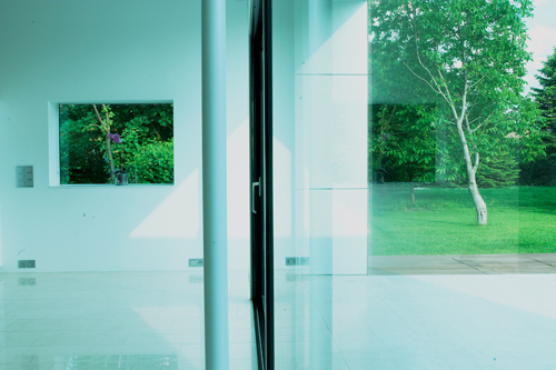 Straßenseitig im Norden zeigt sich die Längsfront verschlossen, bündig sitzen die Fenster von Küche und Bad in der Fassade. Dahinter steht das Auto, ohne die offene Südseite zum Garten zu stören. Wie eine Schatulle fasst das vorgezogene Dach des weißen, über 13 m langen Baukörpers ein Stück Terrasse vor der Wohnküche, bildet eine Nische, in der man windgeschützt sitzt. Darunter schiebt sich plastisch der zweite, etwas niedrigere Quader in den Garten vor. Hinter raumhoher, im unteren Bereich mattierter Verglasung liegen ein Schlaf-und ein Gästezimmer. In der Ostwand ist in 75 cm Brüstungshöhe bündig ein Fenster eingeschnitten, wodurch innen eine aquariumartige Nische mit Blick auf den Pool entsteht, von der Grundgrenze grüßt das alte Holzhäuschen.