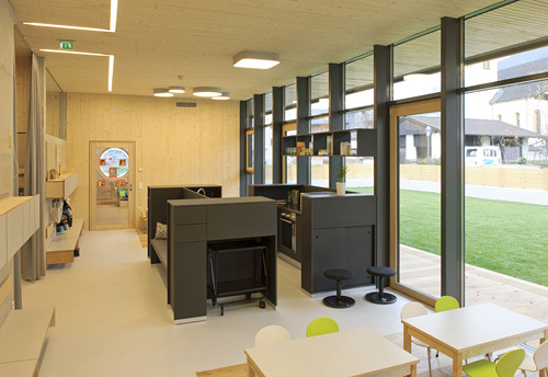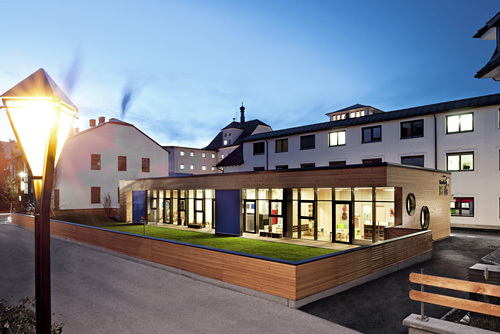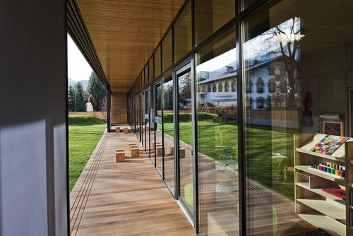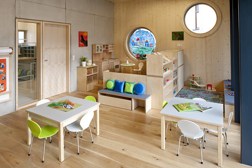 Den Kindern stehen zwei Gruppenräume im Alter von 0 -3 und von 3-6 Jahren zur Verfügung. Ein zentraler Innenraum mit Essbereich und einer Küche dient als Pufferzone einerseits und als Kommunikationszentrum andererseits. Ein Bewegungsraum lässt die Kinder überschüssige Energien loswerden und dient auch als Schlafplatz für die Kleinen. Nebenräume wie kindergerechte Sanitärräume, ein Büro und Garderobenflächen komplettieren das Raumangebot. Es wurden Räumlichkeiten geschaffen in denen sich die Kinder in Ihrer Entwicklungsphase frei und unbekümmert entfalten können. (Text: Architekten)