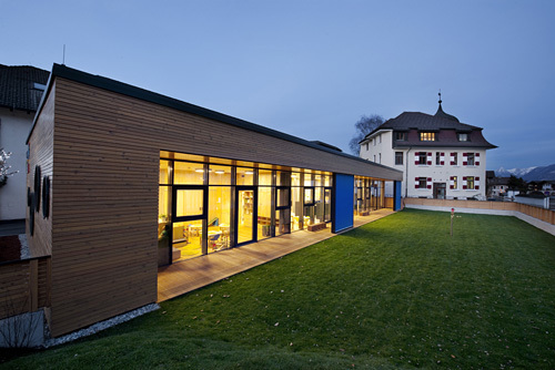Im Ortszentrum von Kundl wurde ein Kindergarten in Niedrigenergiebauweise errichtet. Der eingeschossige Baukörper steht wie ein Bungalow in einer Grünzone, welche den Kindern im südlichen Bereich zusätzlich mit einer Holzterrasse als Spielfläche zur Verfügung steht. Durch die großzügige Verglasung im Süden ist auch eine direkte Verbindung zwischen Innen und Außen gegeben.Das Gebäude wurde als Massivbau mit viel Holz errichtet und zeigt diese Materialität sowohl im Innen- als auch im Außenbereich. Die Räumlichkeiten bieten durch die Wahl von warmen Oberflächen wie Holzböden, Holzwände und auch Holzdecken ein angenehmes Raumklima. Der Gebäudefunktion des Kindergartens entsprechend, wurde bei den gewählten Materialien besonderer Wert auf umweltgerechte, ökologische Baustoffe und Oberflächen geachtet. Hinsichtlich der Gebäudedämmung wurden passivhaustaugliche Komponenten und Wandaufbauten verwendet. Um den hygienisch erforderlichen Luftwechsel zu erreichen wurde ein kontrolliertes Lüftungssystem eingebaut.