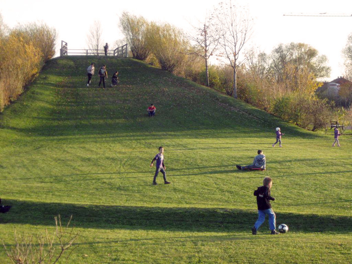 Im ortsnahen Bereich des Parks erhebt sich ein Spielhügel wie eine Insel aus der Flussebene der Triesting und ermöglicht Aussicht über die Weingärten bis ins Ortszentrum In den Hügel sind Doppelseilbahn und Geländerutsche sowie eine öffentliche WC-Anlage und der Technikraum des Parks integriert. Im Winter wird er zum Rodeln genutzt. Um dieses Aktivitätszentrum herum lädt ein Schaukelpark zur Bewegung ein. Sieben verschiedene Typen - von der Wikingerschaukel bis zur Lianenschaukel - werden angeboten.