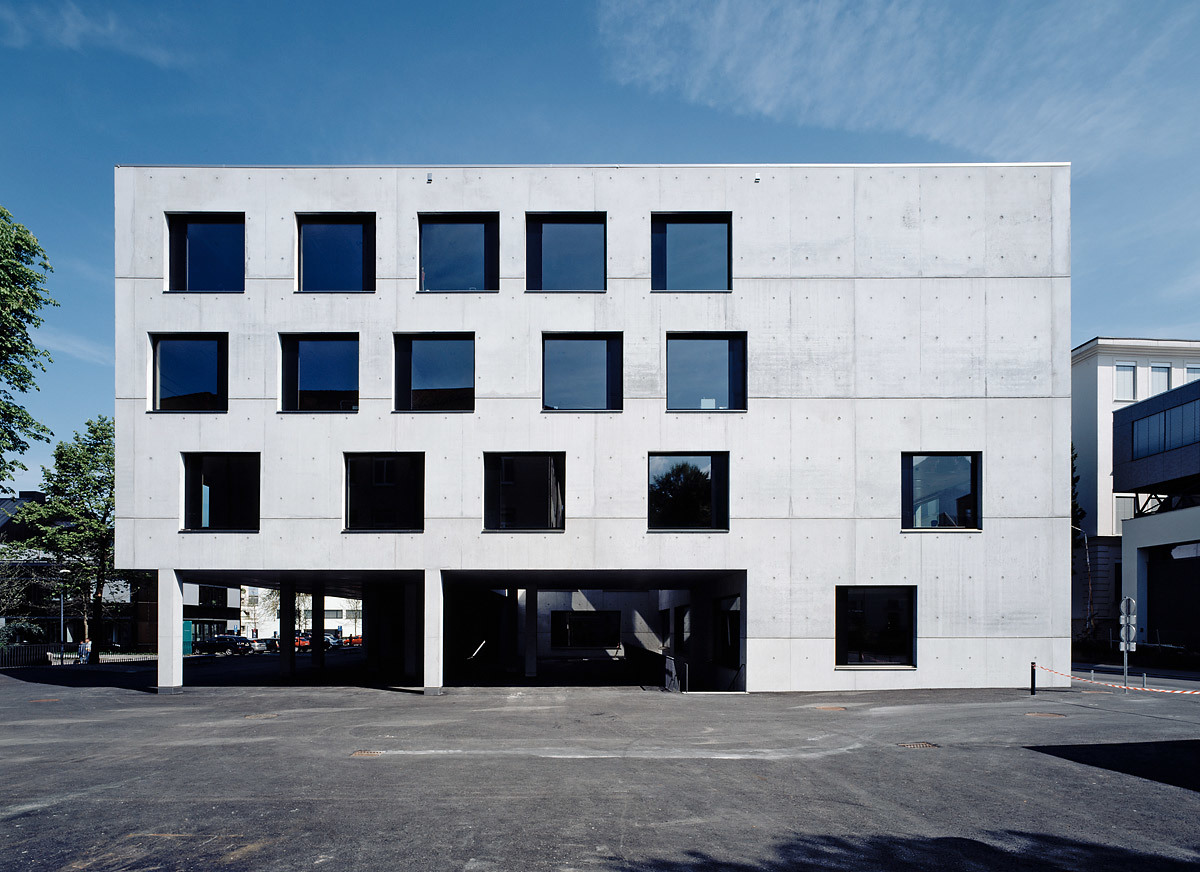 Dem feinen, akkurat geschalten Sichtbeton wird im Inneren ein Wechselspiel von Verkleidungen in Birkensperrholz und Farbflächen entgegengehalten. Grün, Symbolfarbe des Lebens, zieht sich in subtil abgestimmten Nuancen auf Boden und Wänden durchs Gebäude, bringt Räume zum Leuchten und verändert sich je nach Himmelsrichtung und Belichtung. Farbakzente setzen Möbel in Rot und Orange, im Bereich der Aula und des Konferenzzimmers signalisiert der rote Linolboden Rückzug und Kommunikation. Ein weicher, steiniger Weißton neutralisiert das Ambiente in den Sonderräumen.