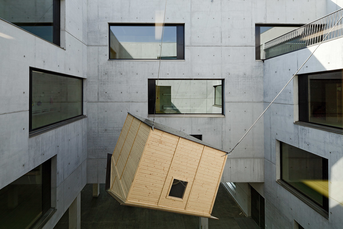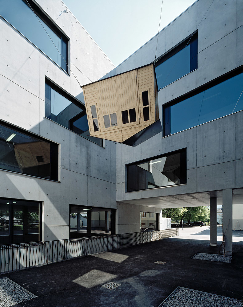 Kompakt sind die Klassen- und Gruppenräume auf drei Obergeschossen um einen zentralen Innenhof gruppiert. Die umlaufenden Erschließungsflächen sind lichtdurchflutete, großzügig dimensionierte Bewegungs- und Spielflächen und ermöglichen mit ihren nahezu raumhohen Öffnungen wertvolle Aus- und Durchblicke. Auch in den Gruppenräumen rückt die Umgebung durch große Fensterrahmen als Stadt- und Naturraum ins Blickfeld. Der Lichthof mündet im Erdgeschoss in einen überdachten Pausenhof und liefert selbst dem im Untergeschoß eingeschobenen Turnsaal genügend Licht über den zusätzlichen Einschnitt der geschickt angeordneten Fluchttreppe.