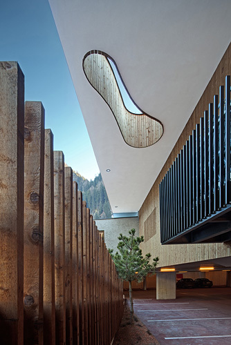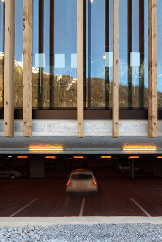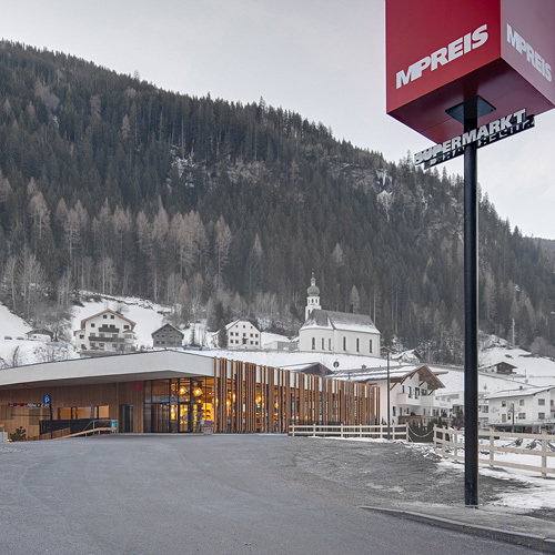 Aufgrund der sehr kurzen Bauzeit von nur 5 Monaten entschied man sich bei der Tragkonstruktion für eine Kombination aus Stahlbetonträgern und Holzdeckenelementen. Die Materialauswahl im Innenausbau und bei der Außenhülle reagiert bewusst auf die Rauheit der Umgebung. Auf der Parkebene wurden sägerohe Fichtenbretter mit unterschiedlicher Stärke in die Betonschalung eingelegt, in der Verkaufsebene schafft sägerohe Thermofichte in Kombination mit dem rohen Sichtbeton eine entsprechend freundliche Atmosphäre.