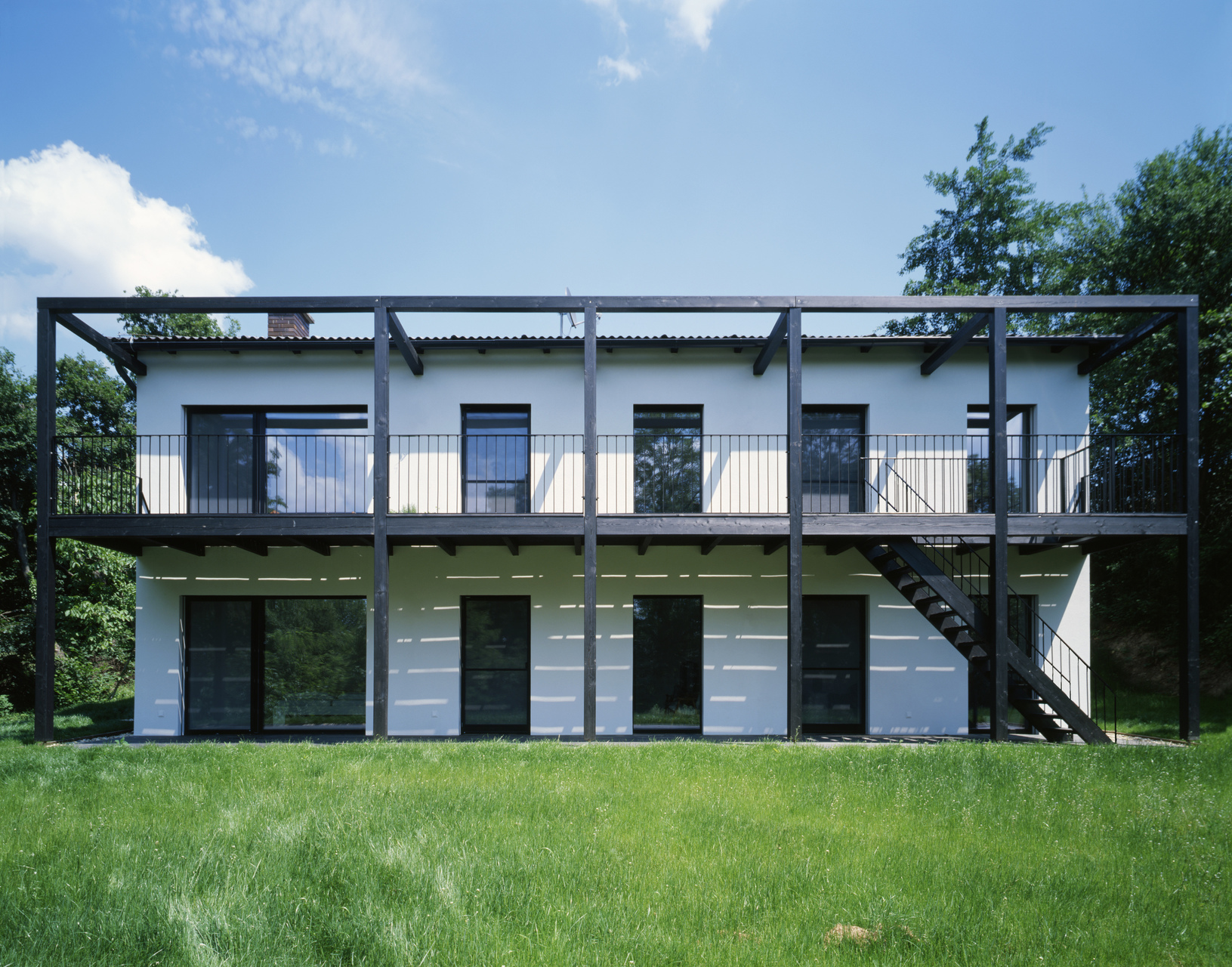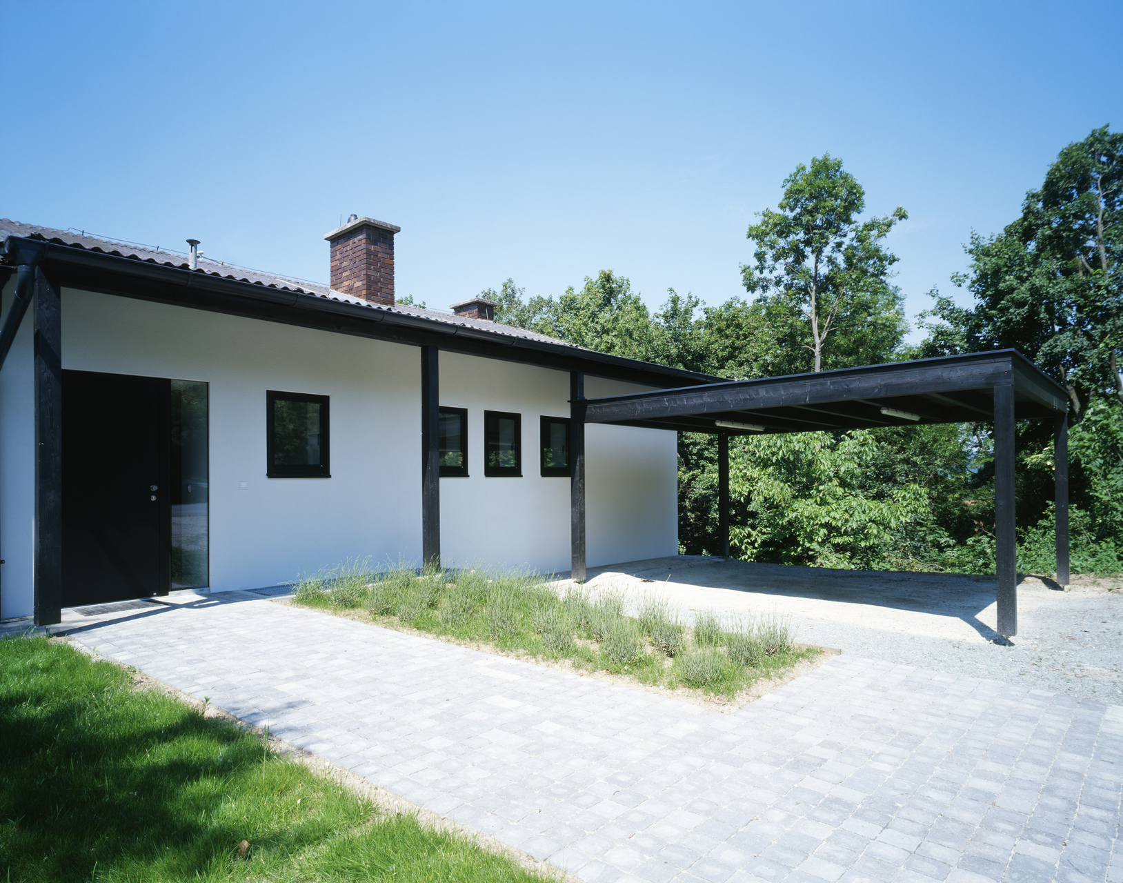 Die Architekten fügen dem Haus gemäß dessen Potential eine neue Ordnung hinzu und ergänzen das Raumgefüge mittels gezielten Eingriffen zu einem ansprechenden Gesamtprojekt. Eine Veranda an der Südfassade schafft Freiraum und bildet in Kombination mit den neuen Fenstertüren einen interessanten Übergang zwischen innen und außen. Die dunklen Balken und Stützen des Holzbaus stellen sich als zweite Fassade vor den Bestand. Die vorgelagerten Terrassen bilden auf beiden Geschossen hochwertige Zwischenräume und erwirken somit eine Steigerung der bestehenden Raumqualität.